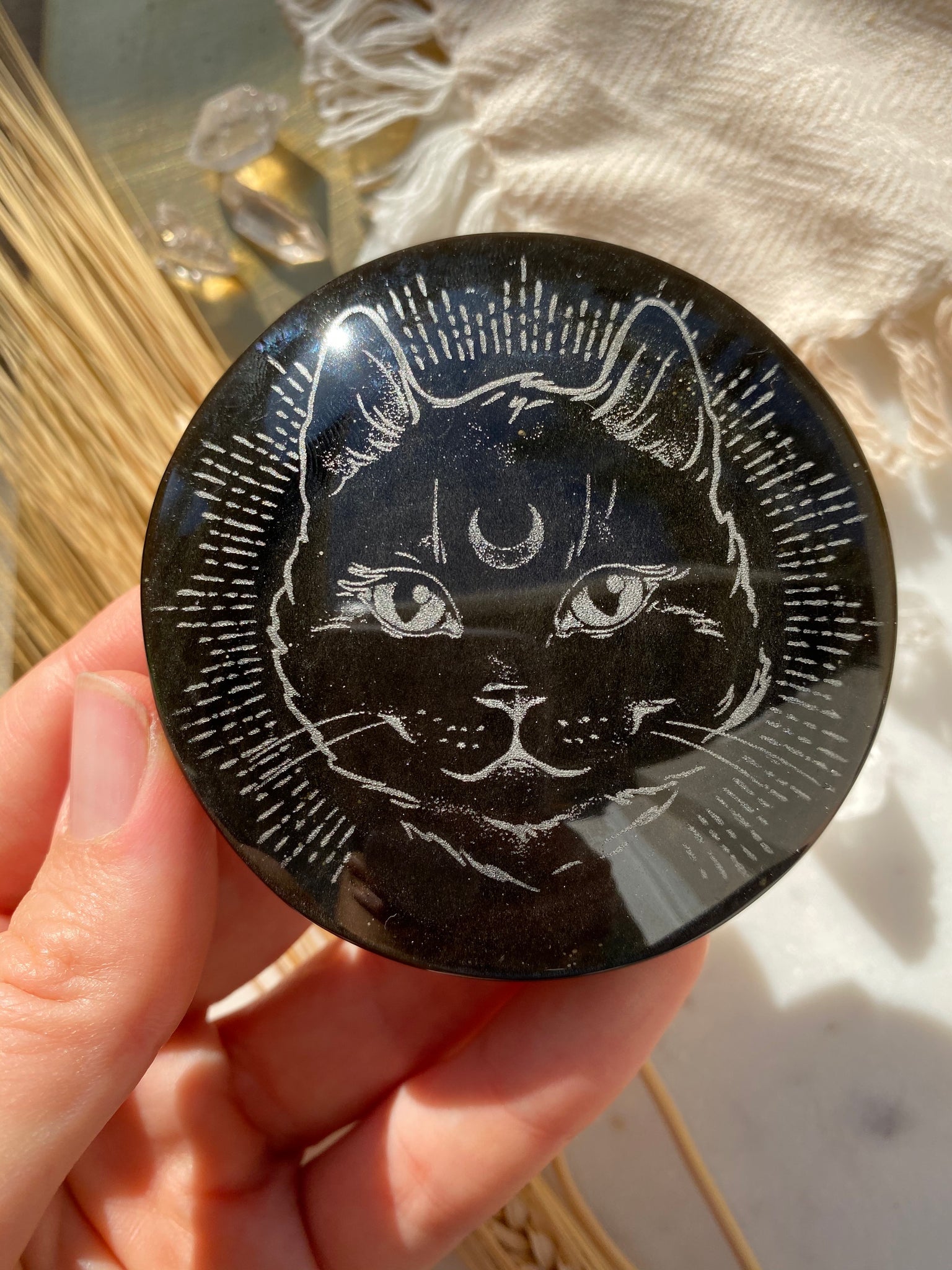 Gold Sheen Obsidian Disc Crystal Grid with ”Midnight Familiar” Magical Black Cat with Crescent moon on forehead