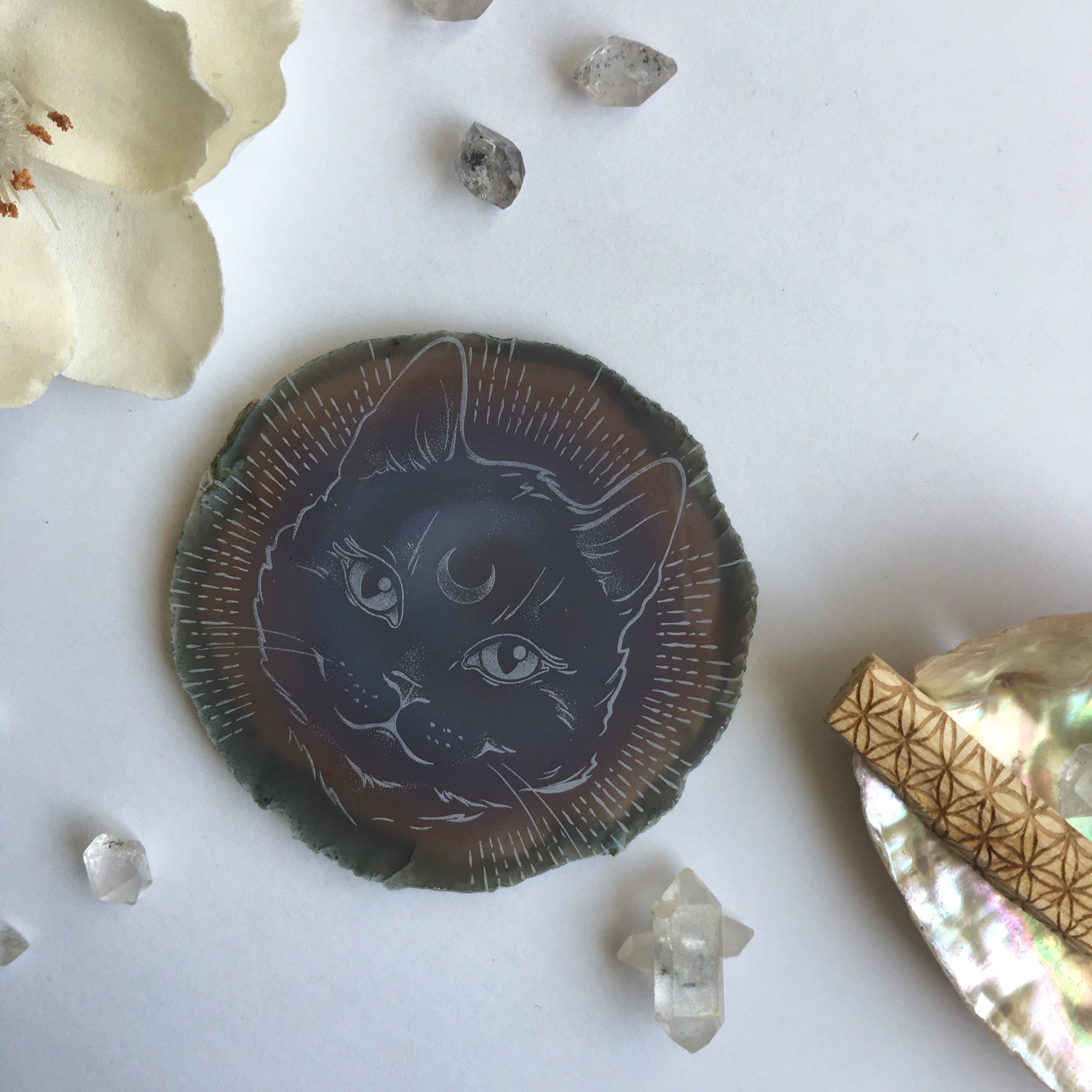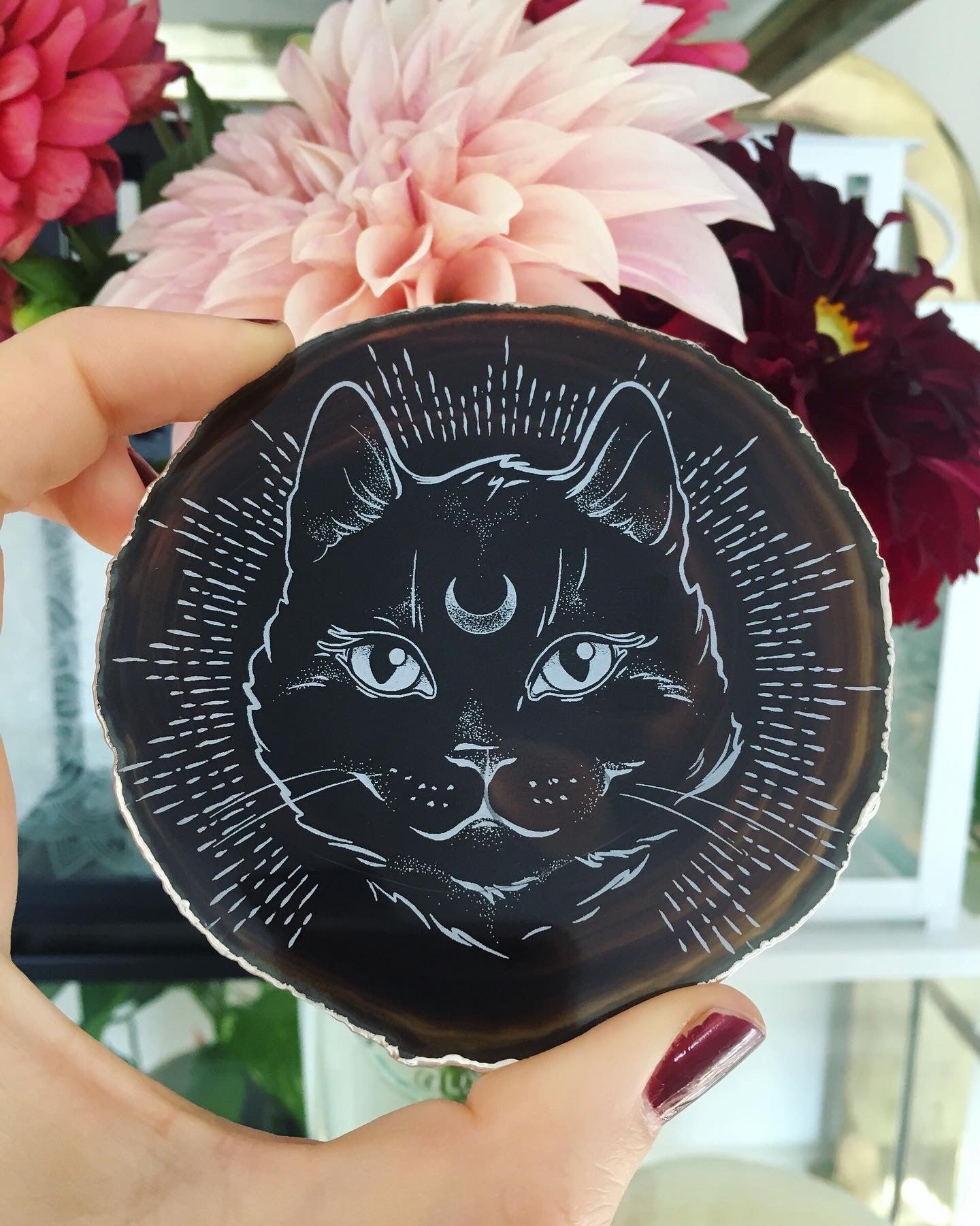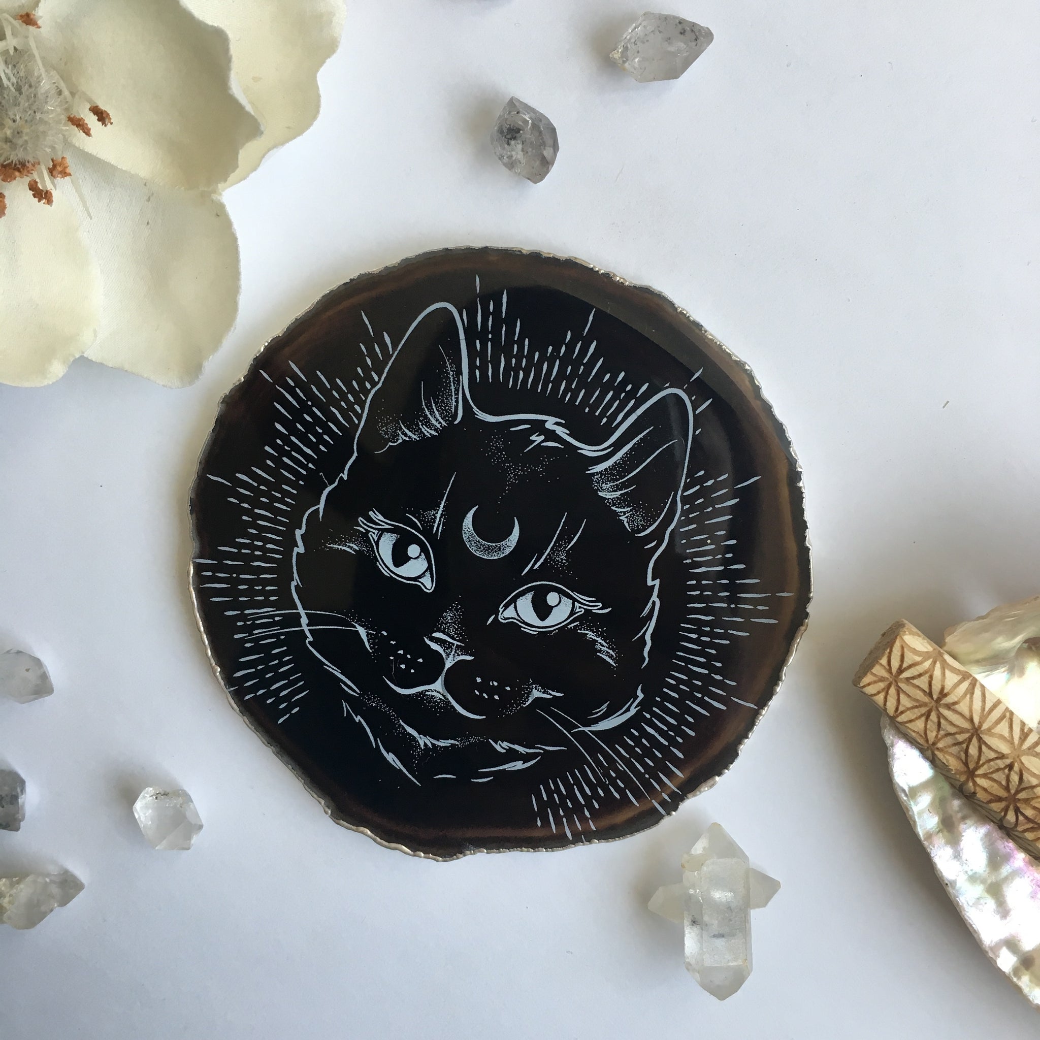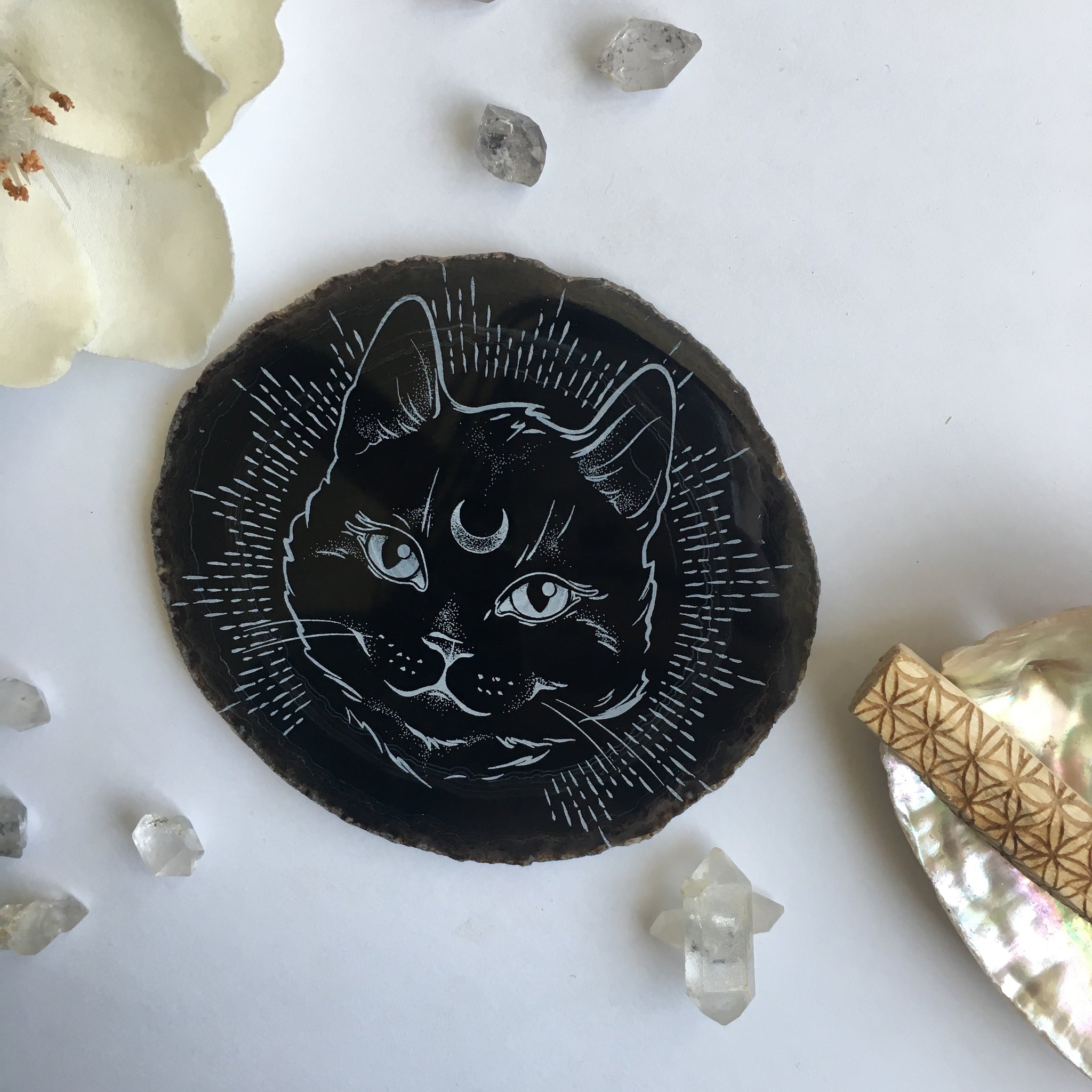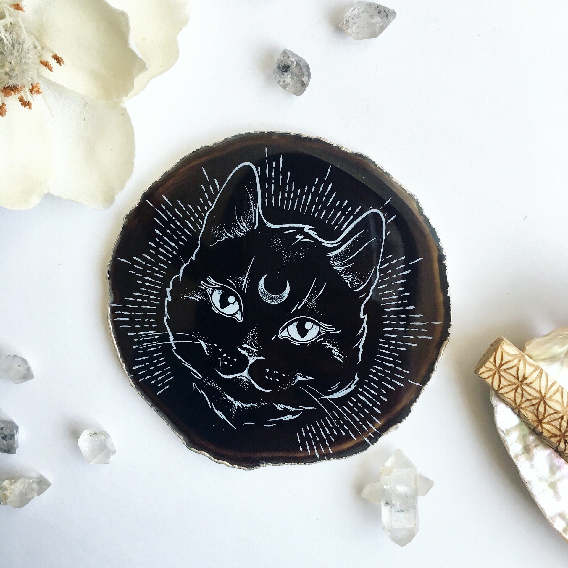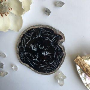 Beautiful Black Agate with Cute magic cat with crescent moon on forehead. Select your size and color from the drop down menu.