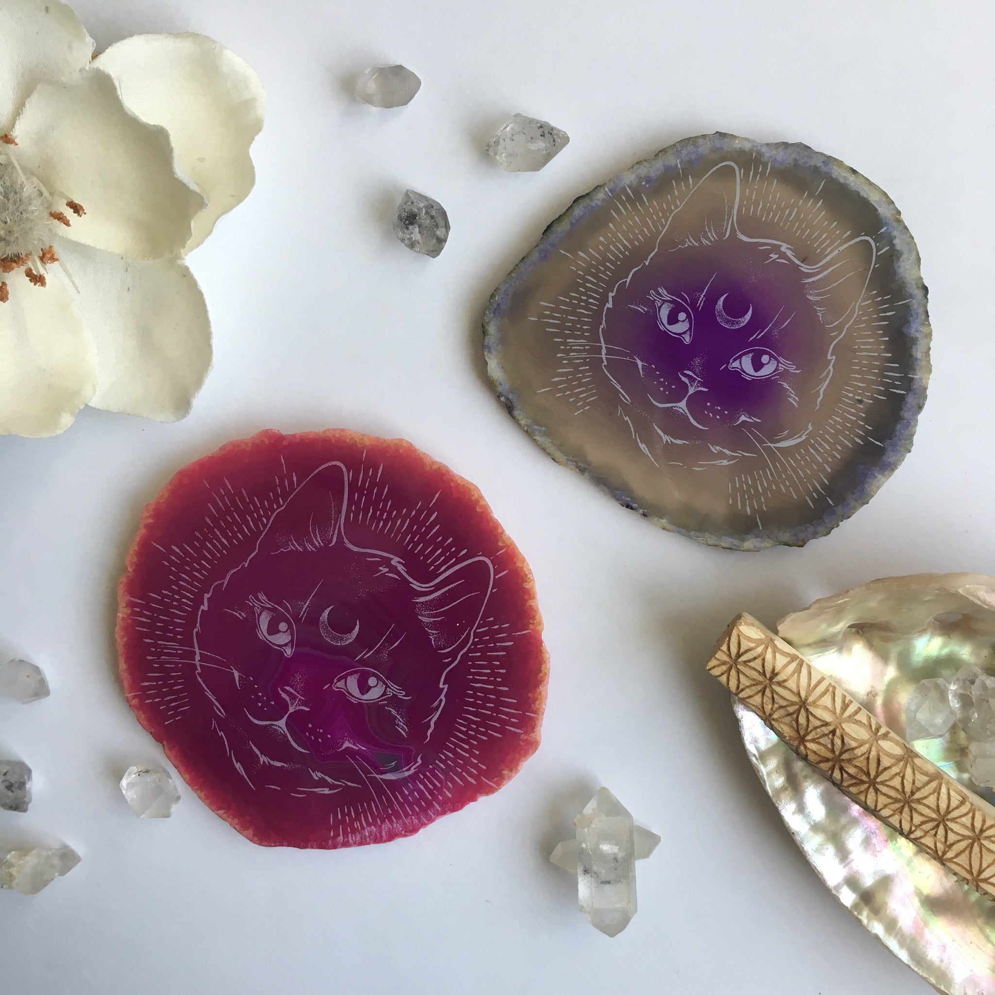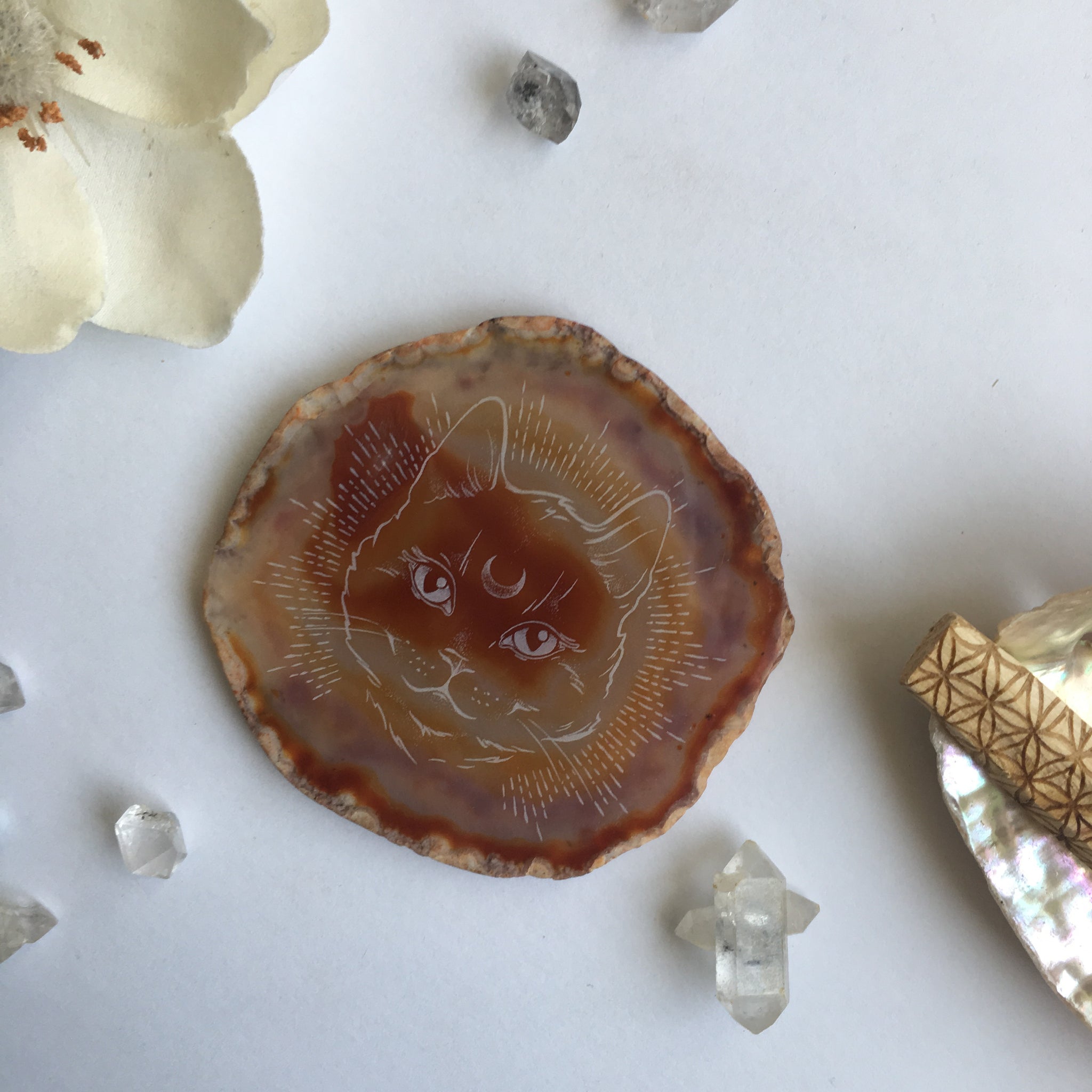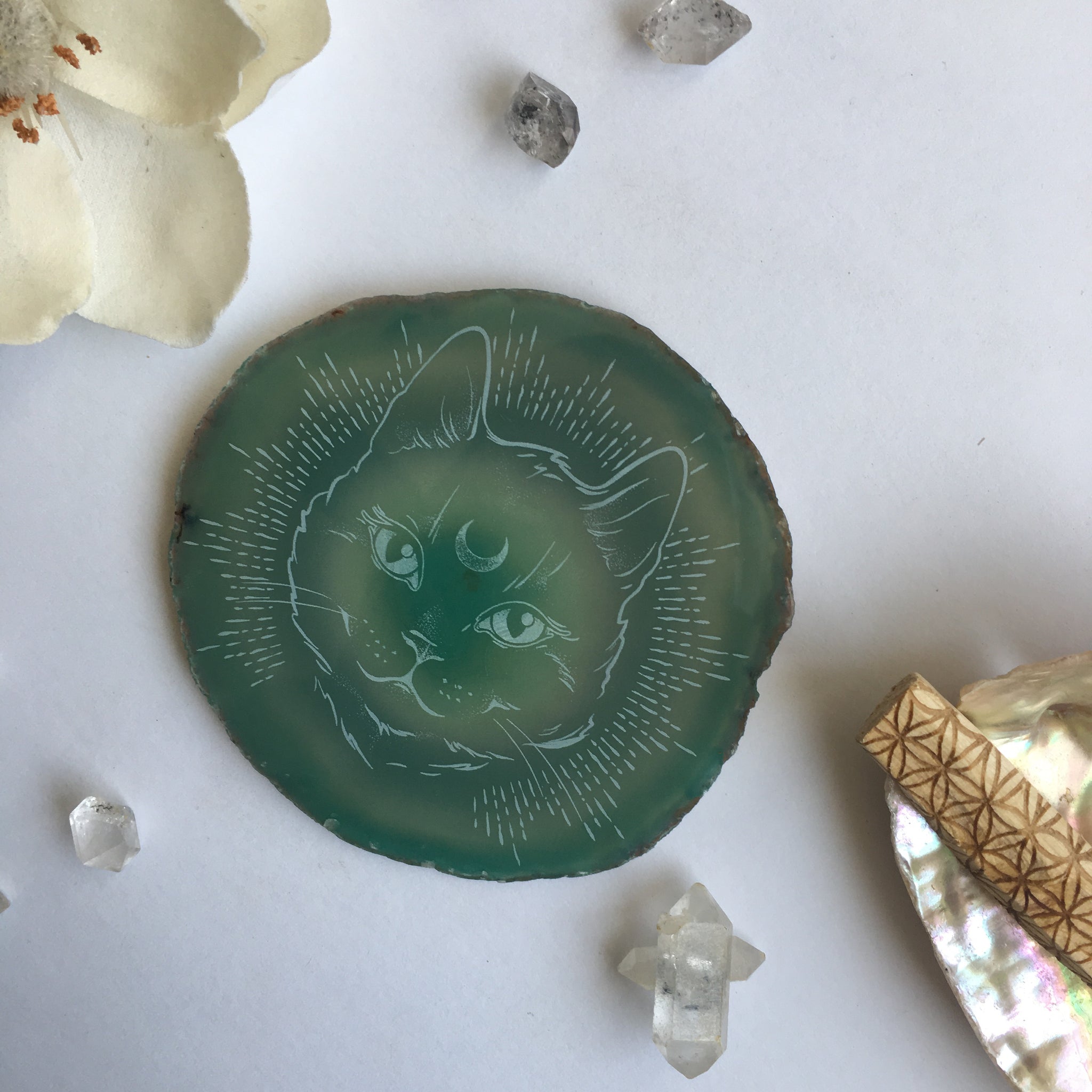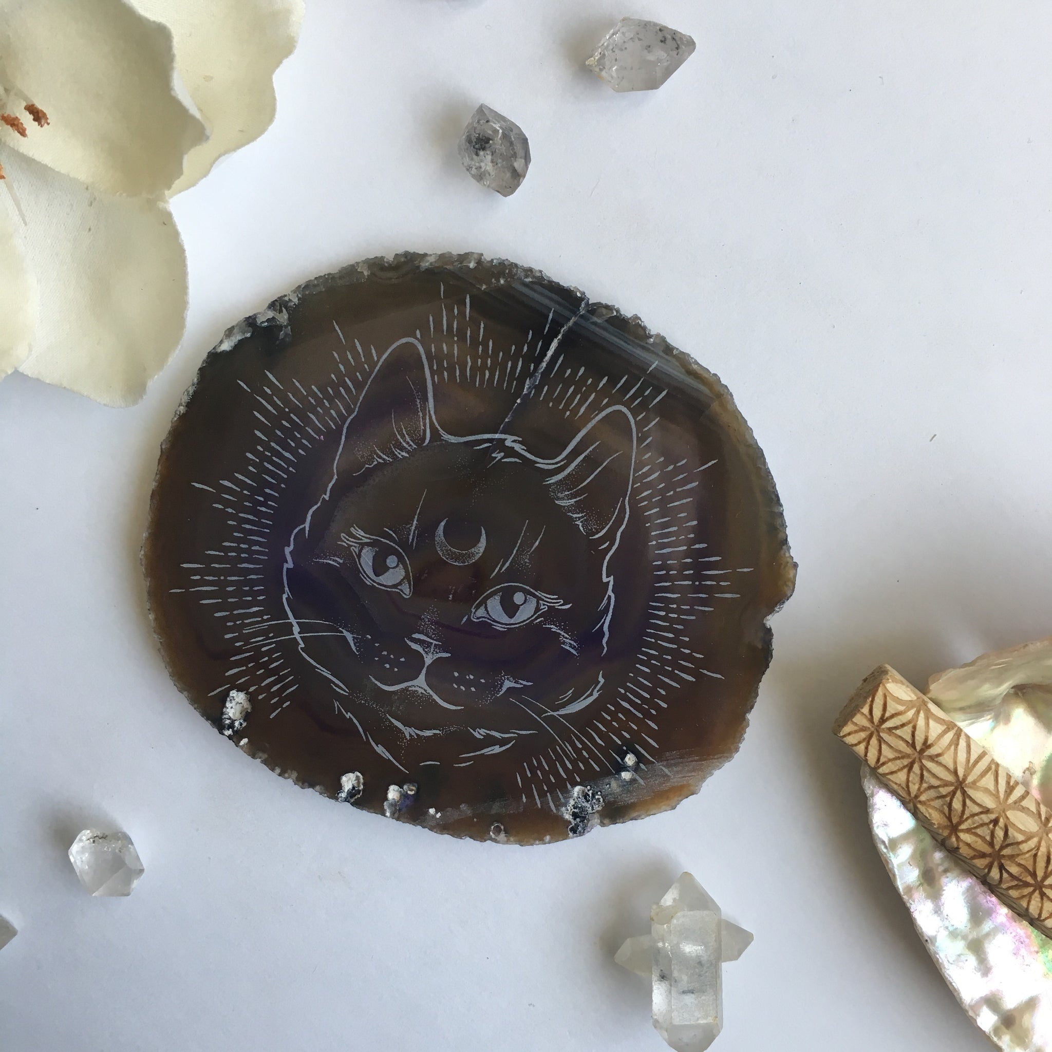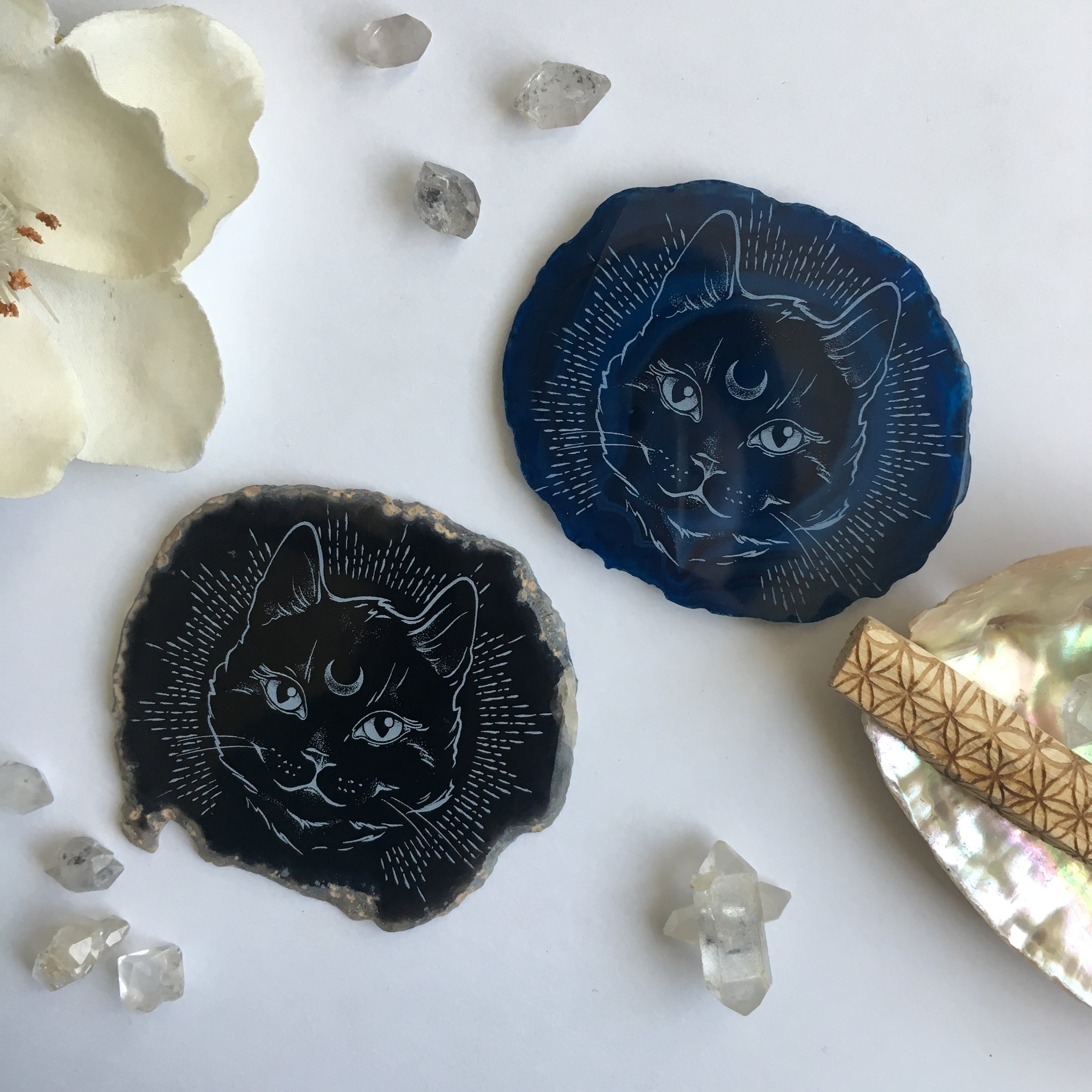 Beautiful Black Agate with Cute magic cat with crescent moon on forehead. Select your size and color from the drop down menu.