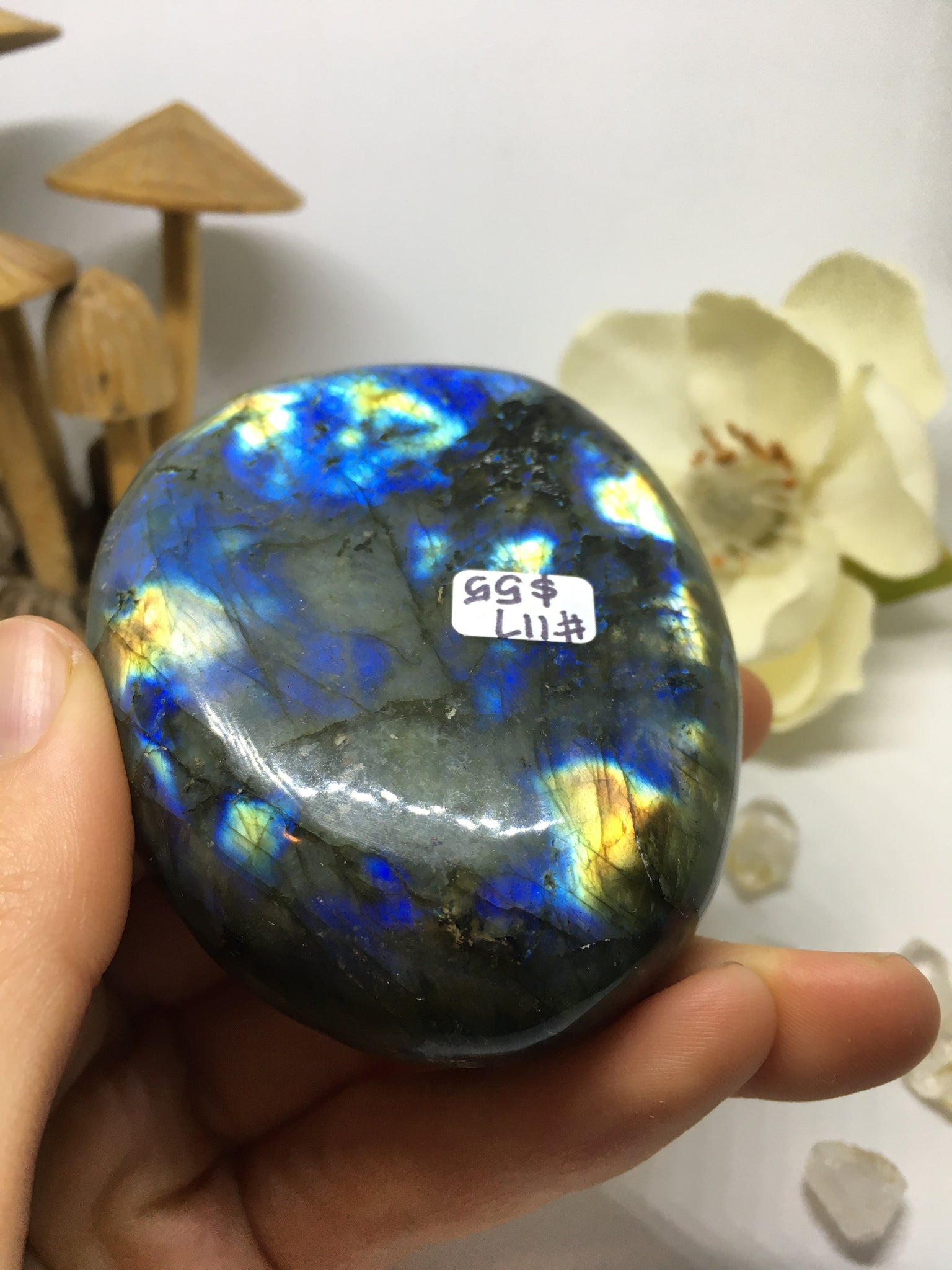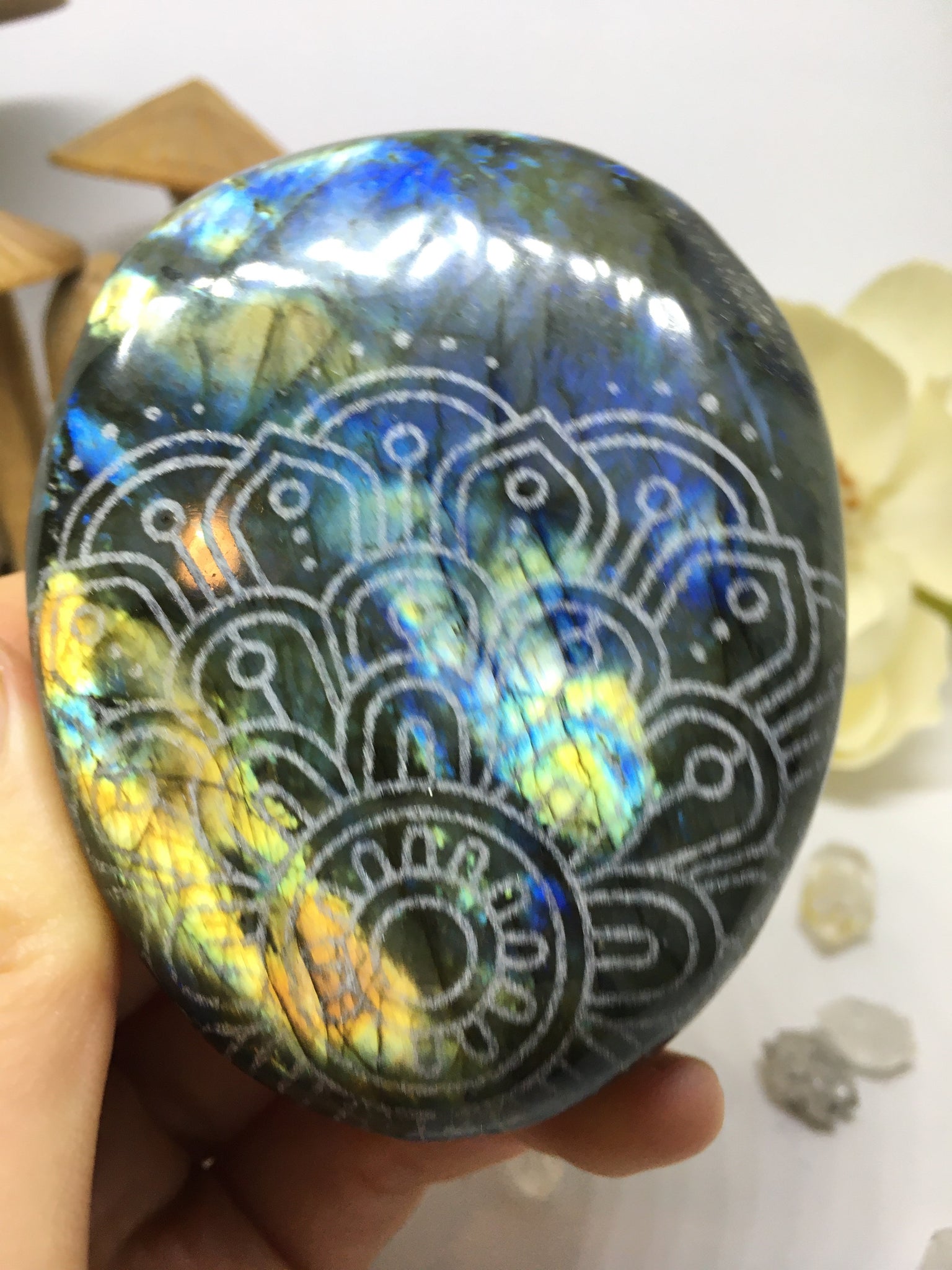 #117 Magestic Extra Large Labradorite Palmstone Etched with Cute Mandala