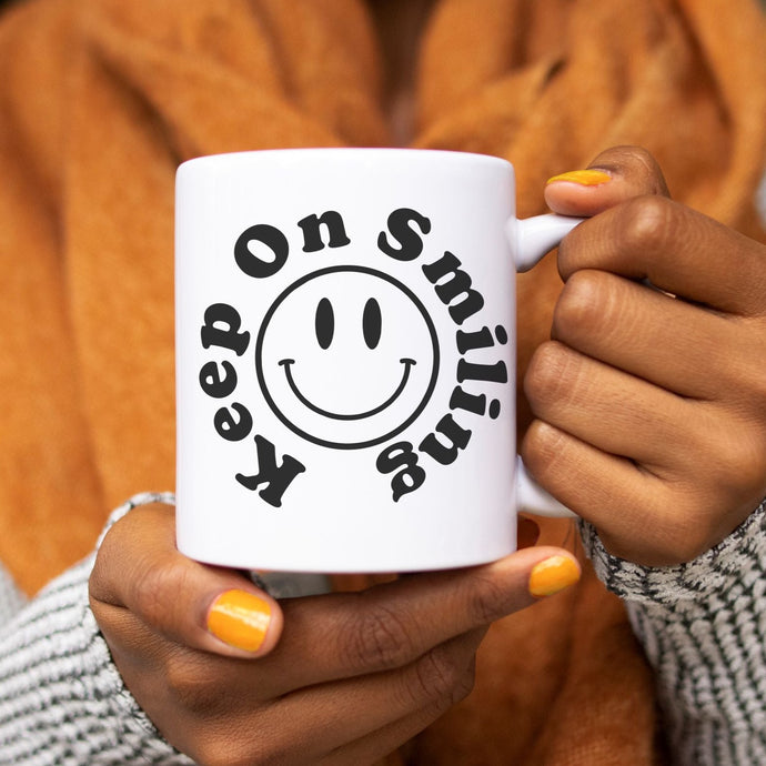 Positive Sayings Mug- Keep on Smiling Mug - Funny Quotes Coffee Mug, Retro Smiley Face Tea Mug, Vintage happy Face, Gift for Coffee Lover,