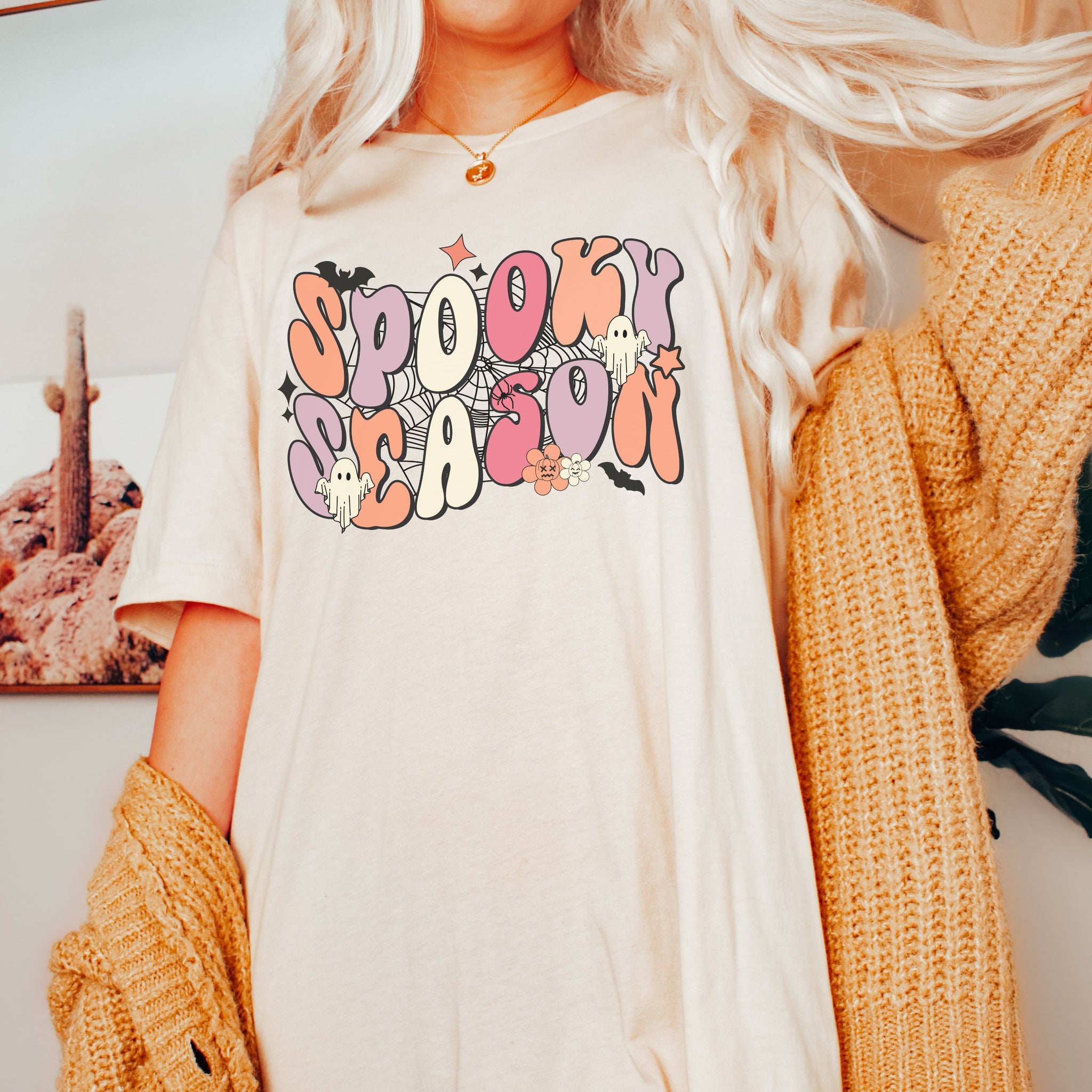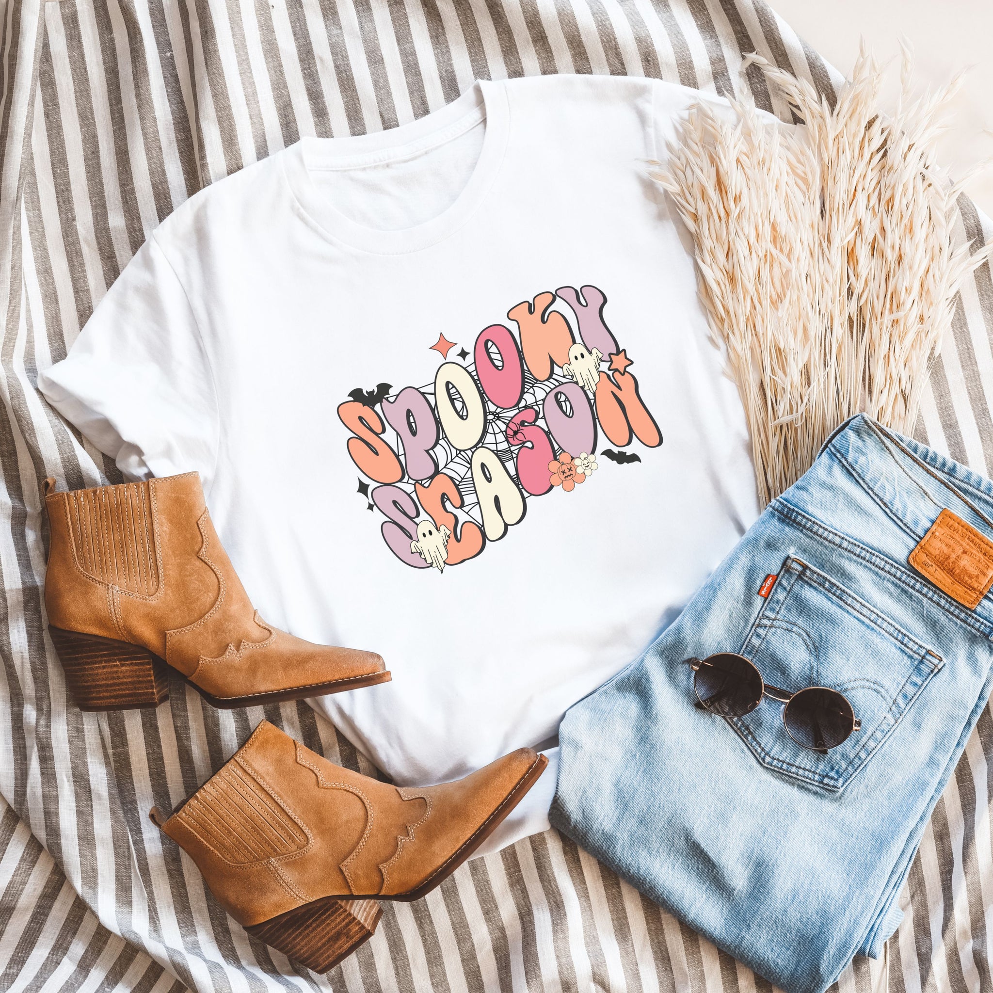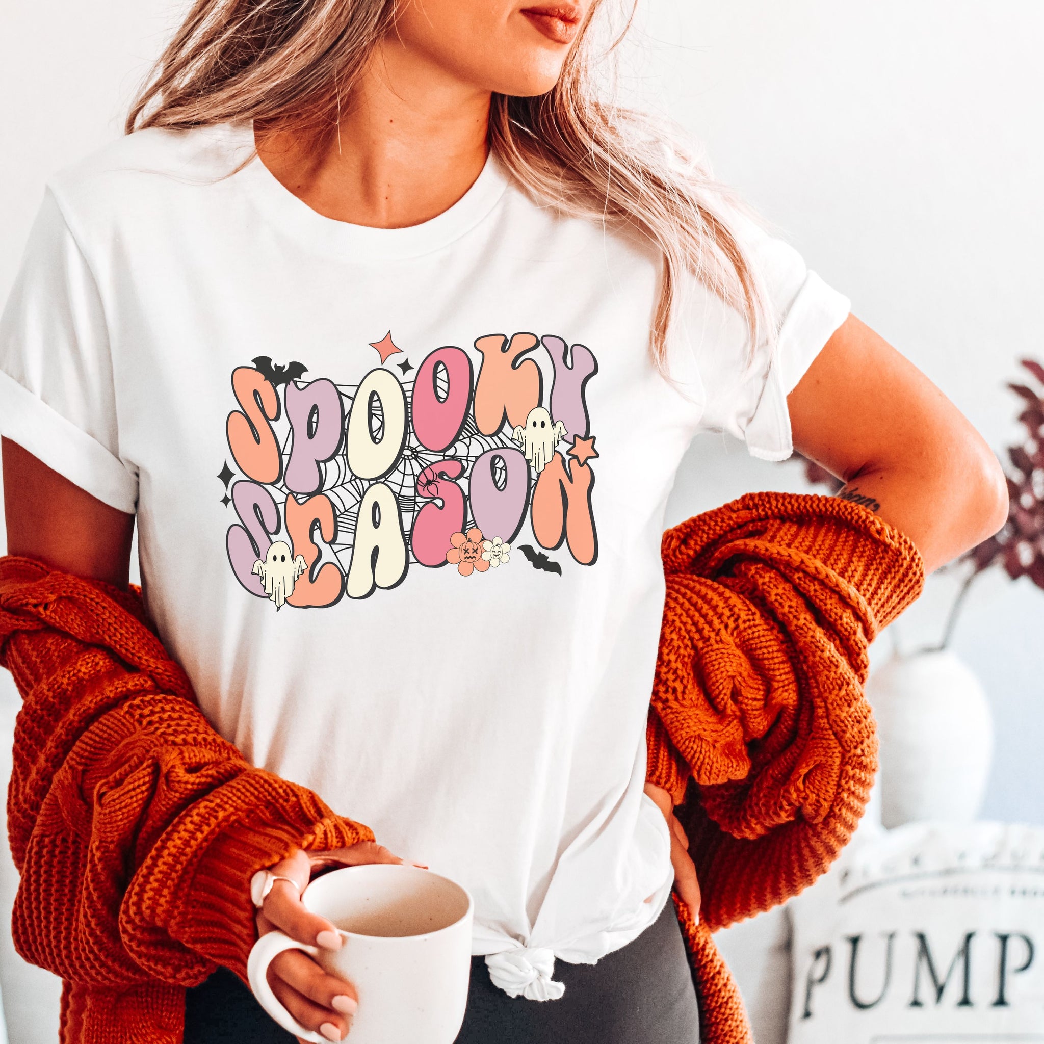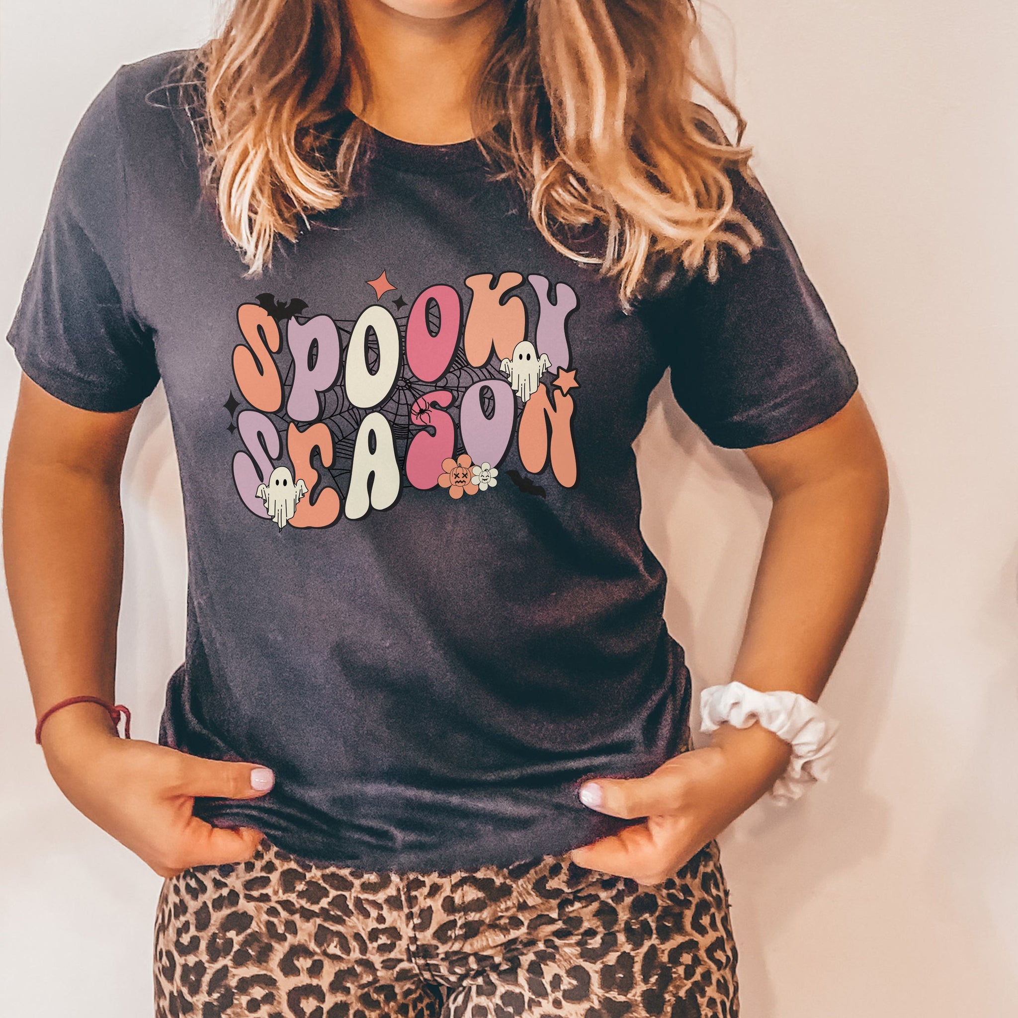 Stay Spooky all Halloween season long with this adorable t shirt featuring "Spooky Season" In a colorful retro font, accented by pumpkins, bats and ghosts.