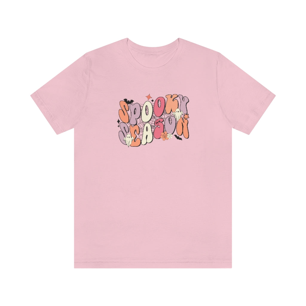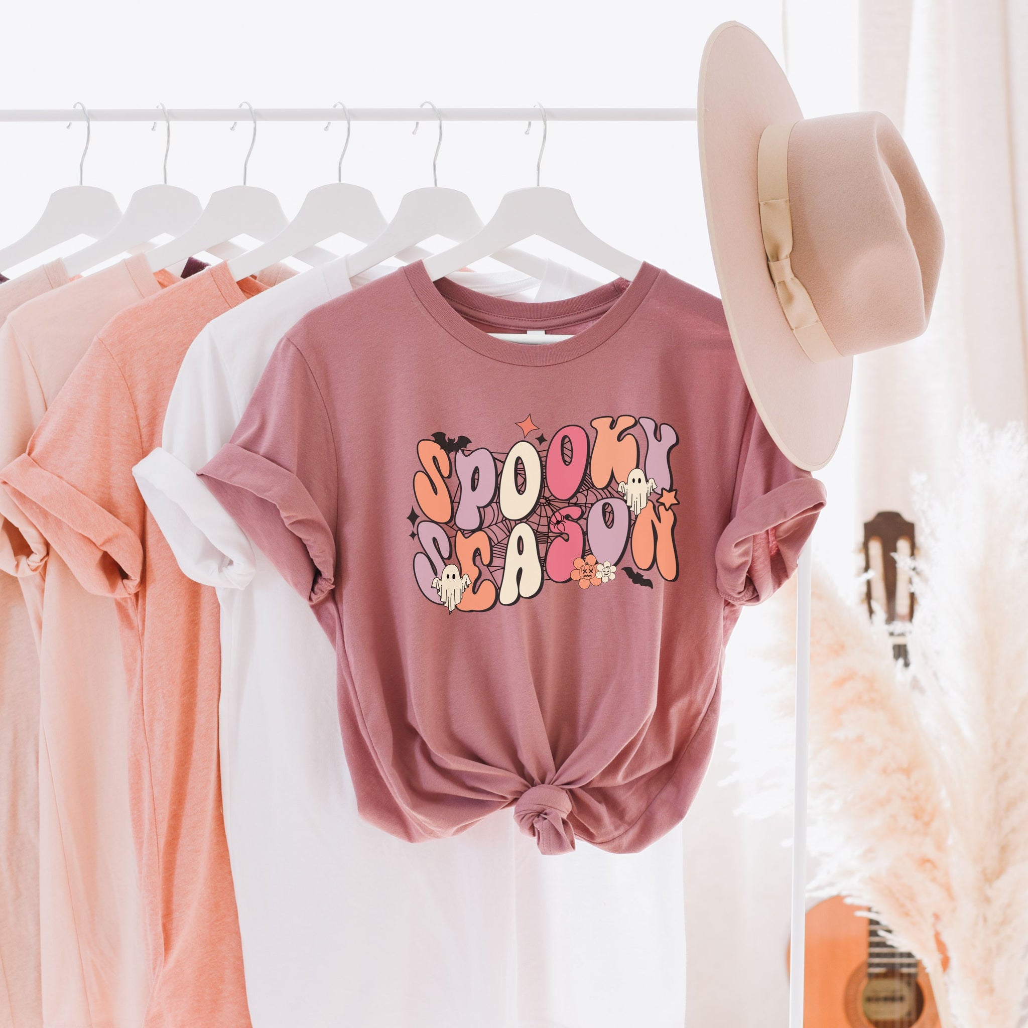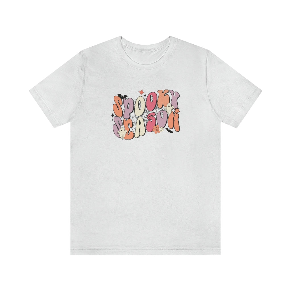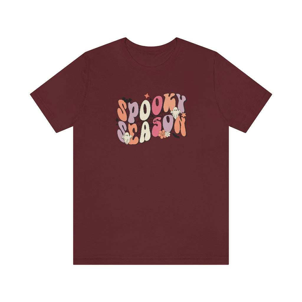 Stay Spooky all Halloween season long with this adorable t shirt featuring "Spooky Season" In a colorful retro font, accented by pumpkins, bats and ghosts.