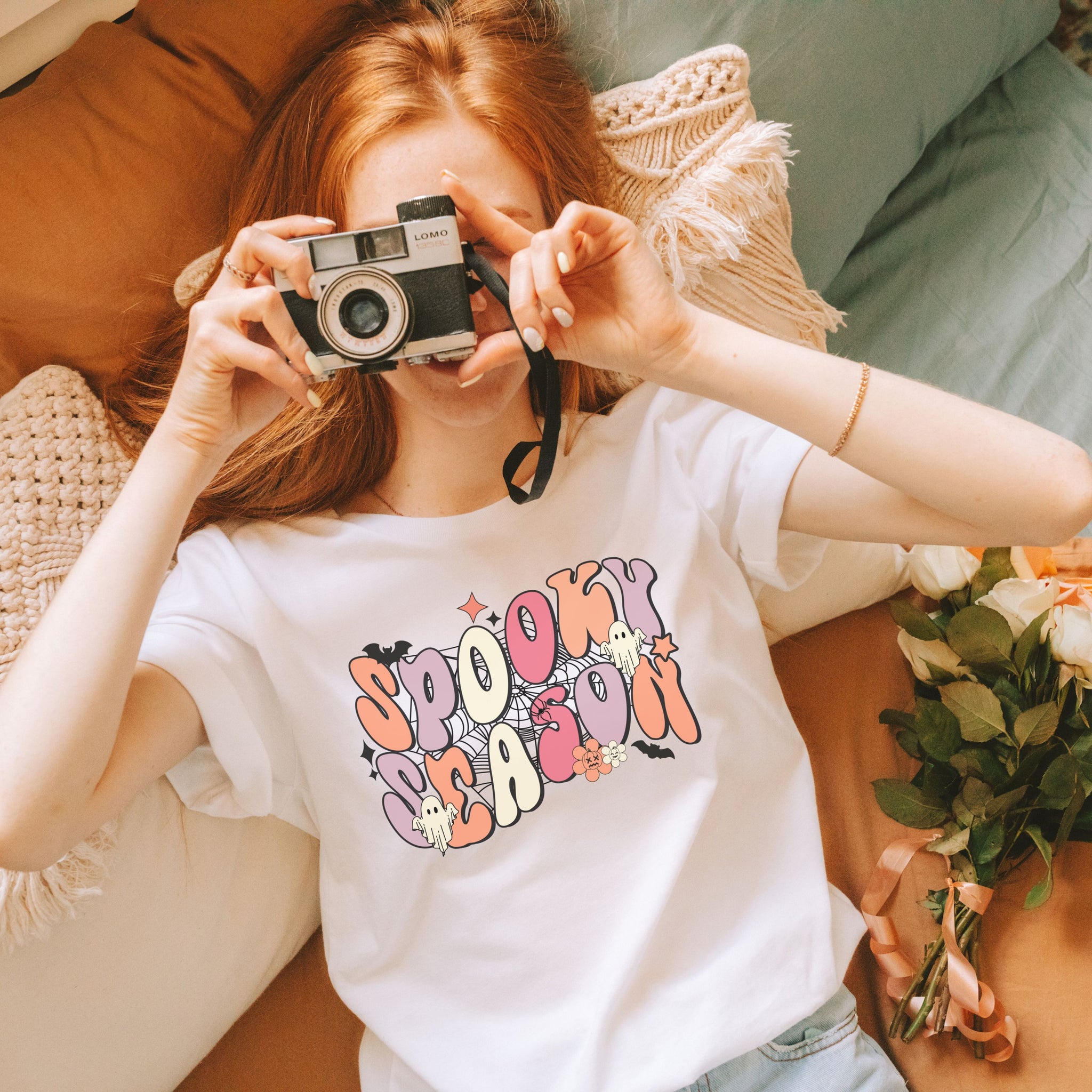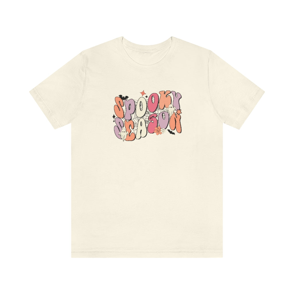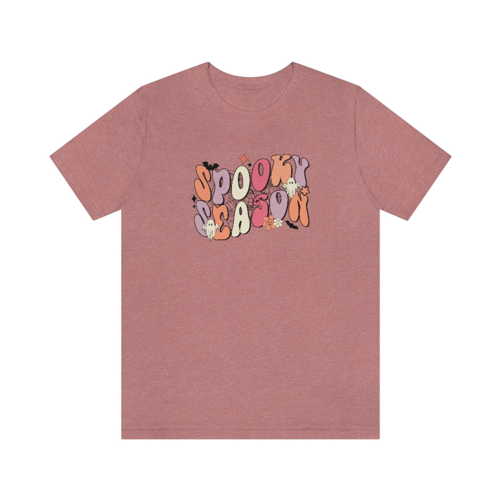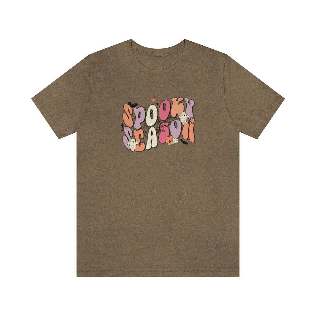 Stay Spooky all Halloween season long with this adorable t shirt featuring "Spooky Season" In a colorful retro font, accented by pumpkins, bats and ghosts.