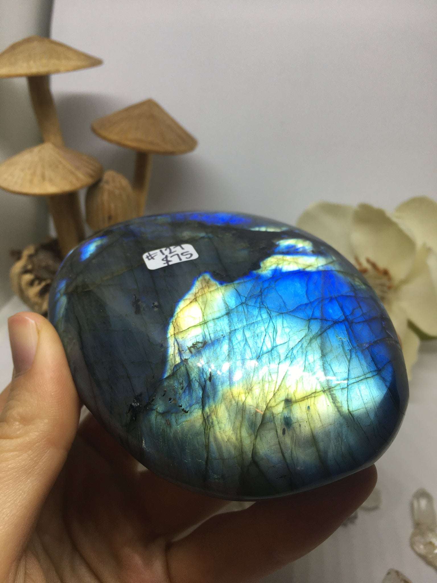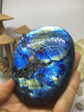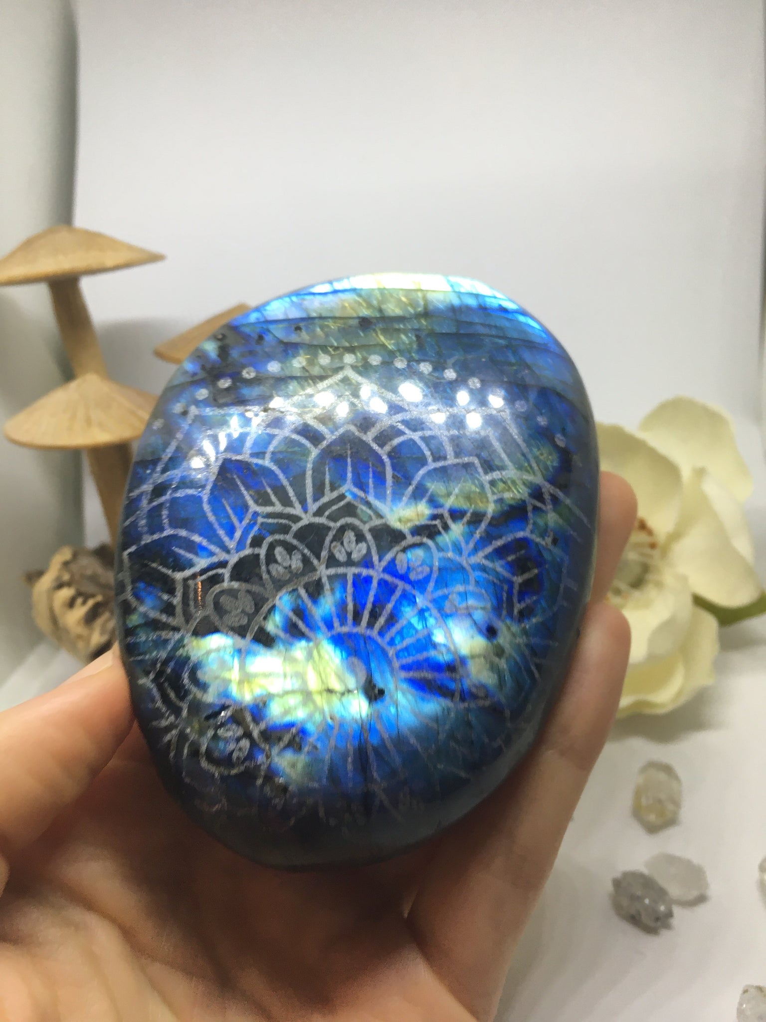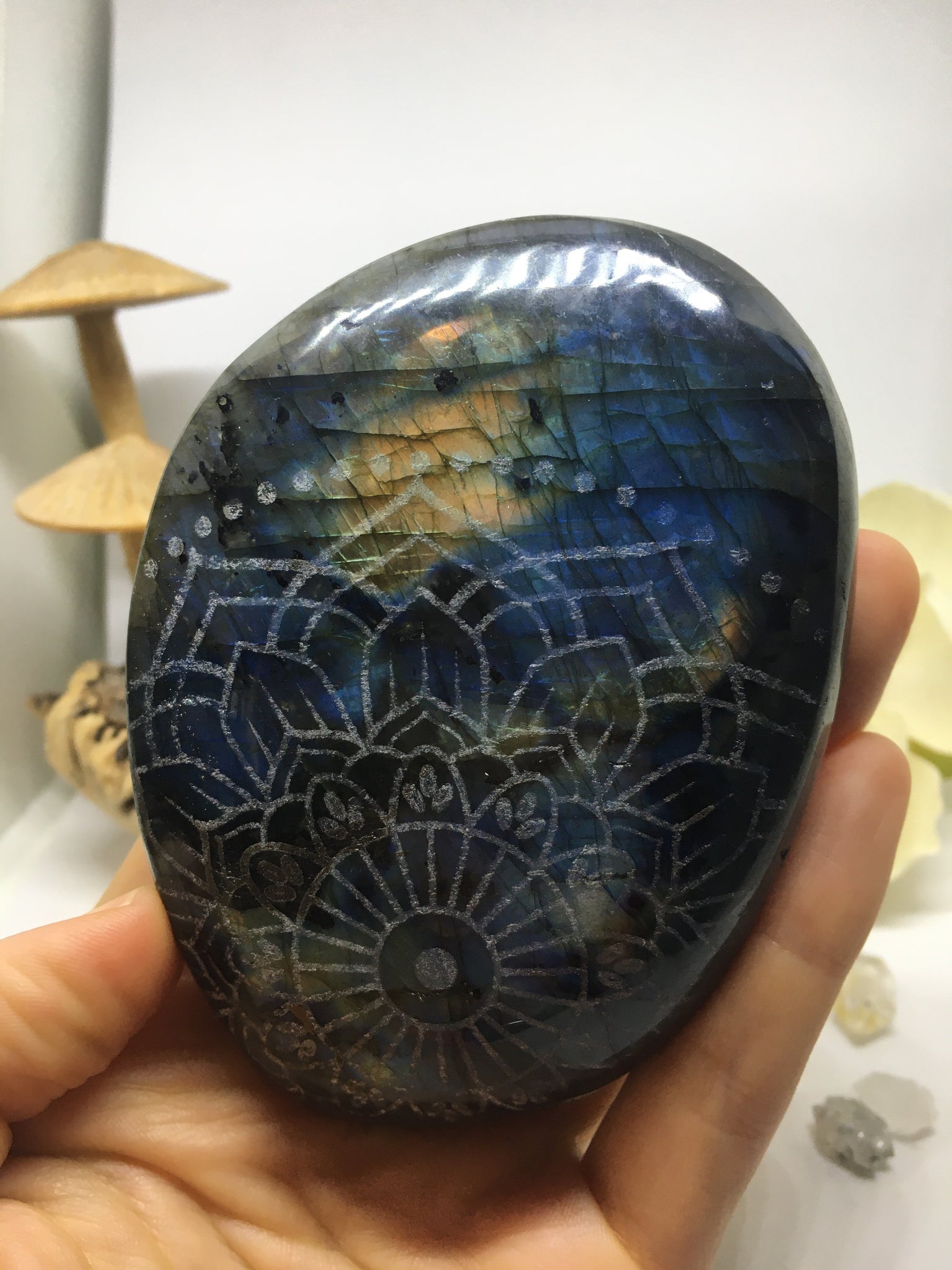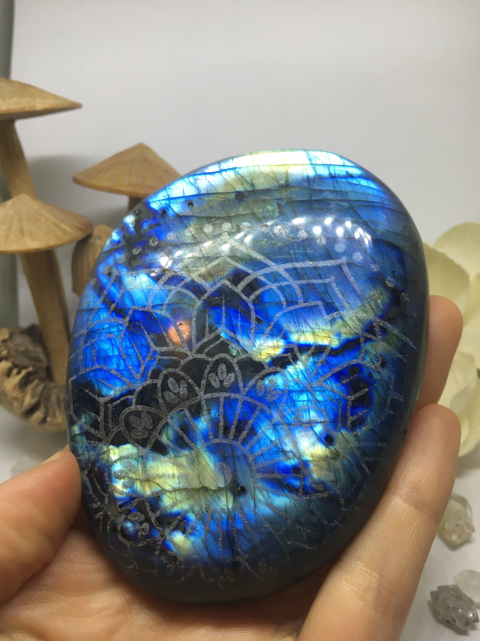 #127 Stunning Extra Flashy Electric Blue and Green Extra Large Labradorite Palmstone Etched with Radiate Bliss Mandala