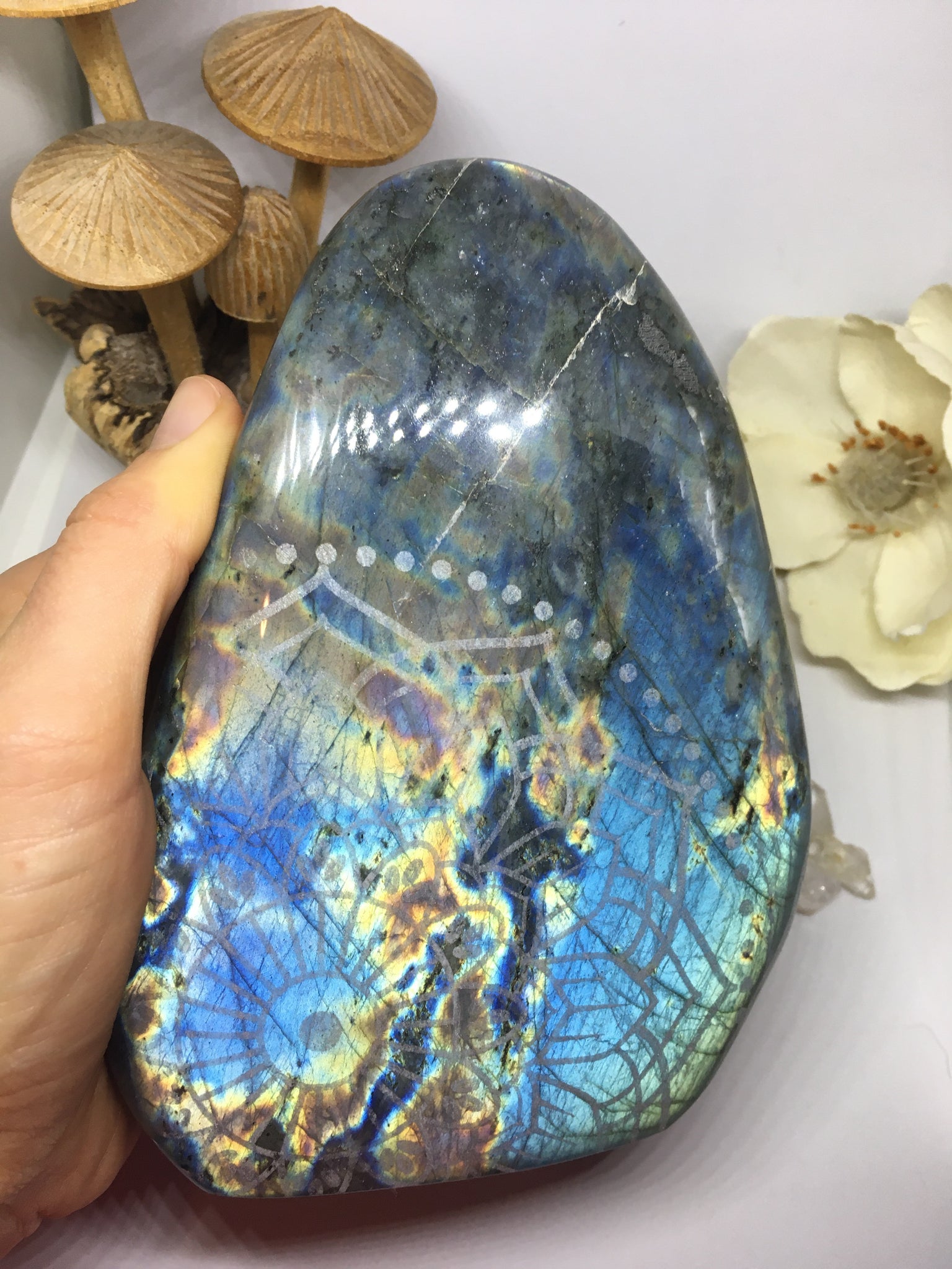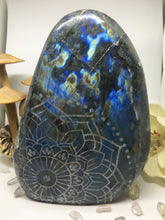 #140 Gorgeous Pink and Blue Extra Large Labradorite Standing Freeform Etched with Radiate Bliss Mandala