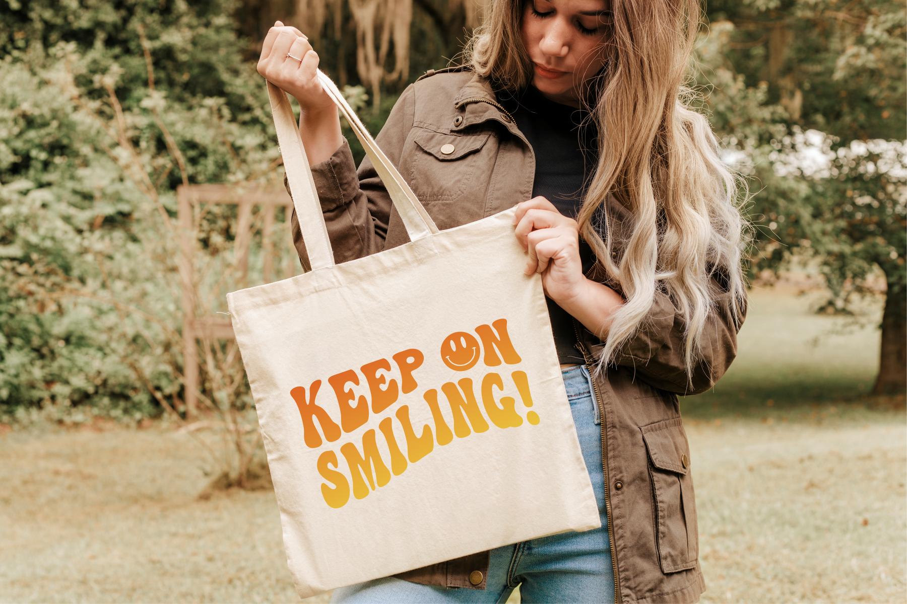 Share your positive vibes with this Smiley Face Natural Canvas Tote Bag. Printed with a retro ‘90’s style funny quote, this Reusable shopping bag can be used as a grocery shopping bag, book bag, overnight bag or everyday purse.