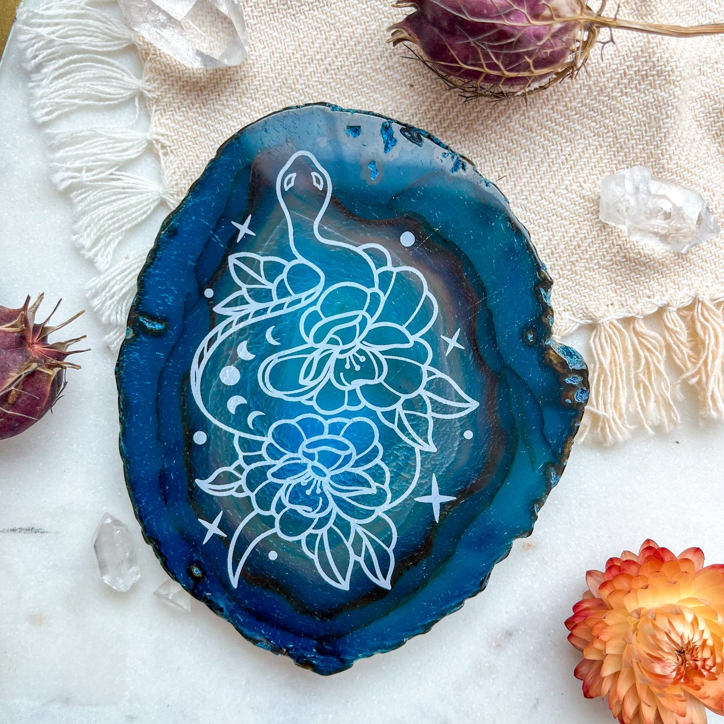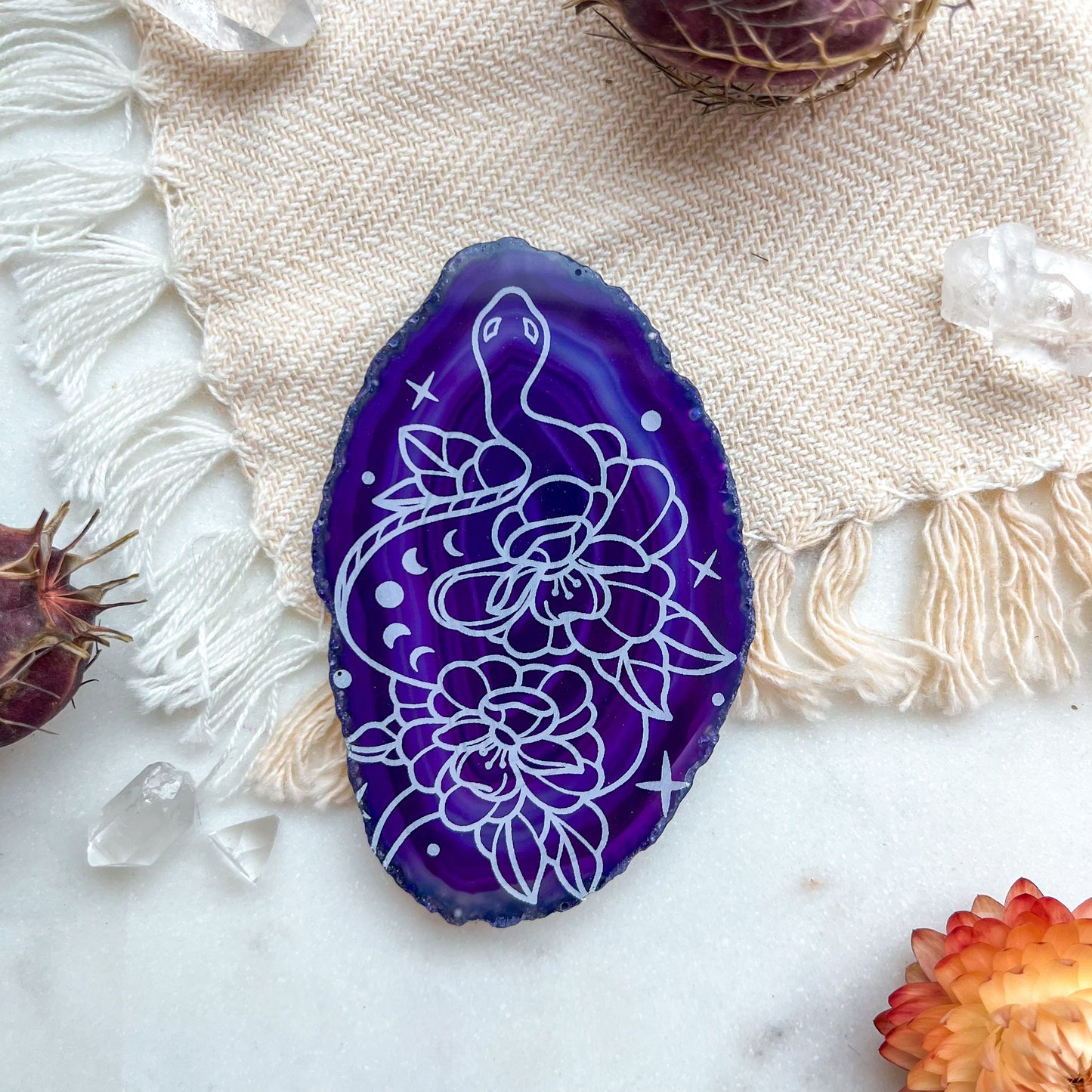 Introducing our mesmerizing Agate Slices, now infused with grounding energy perfect for the Halloween season. Each slice is a natural work of art, intricately engraved with eye-catching designs that bring a touch of elegance to your autumn decor or sacred space.