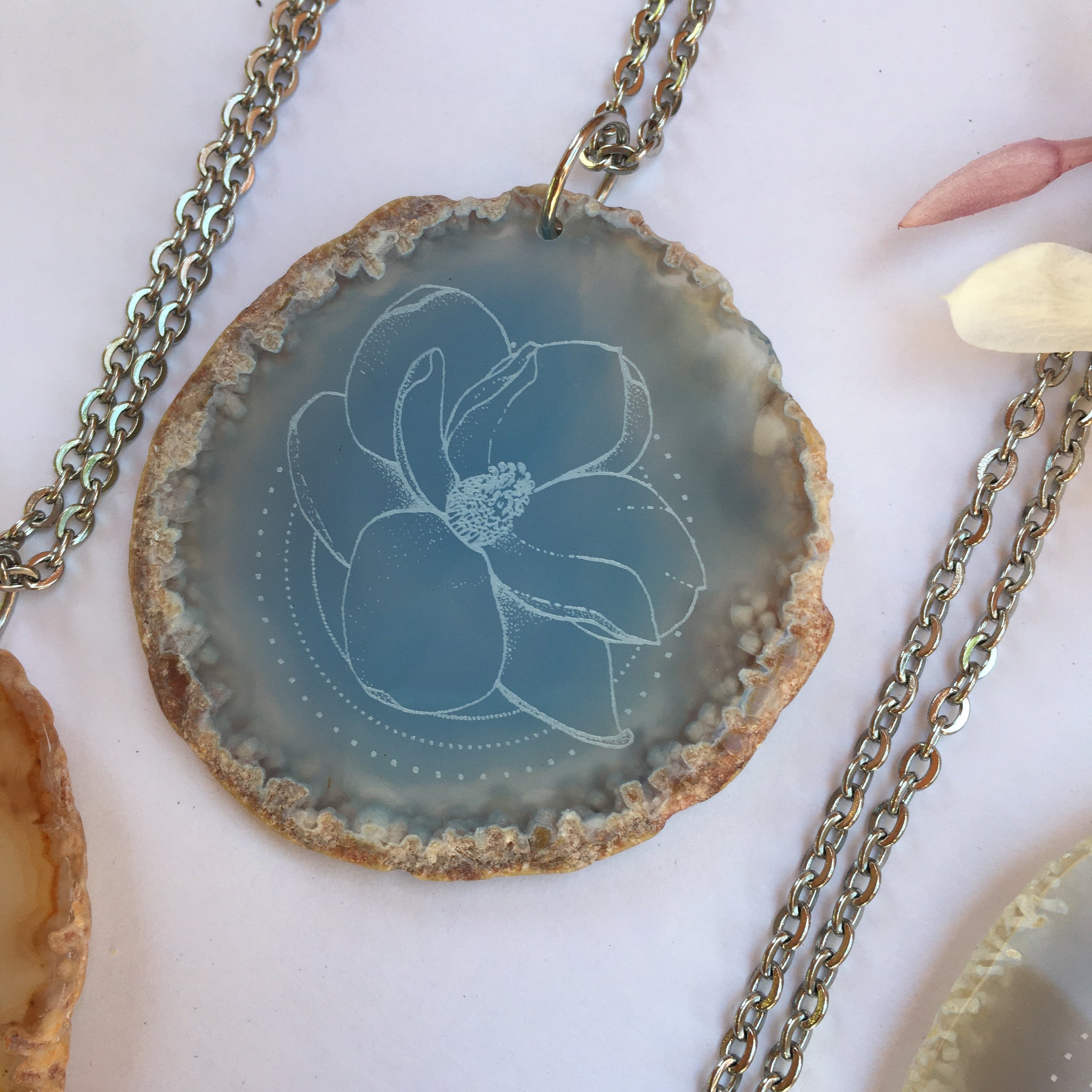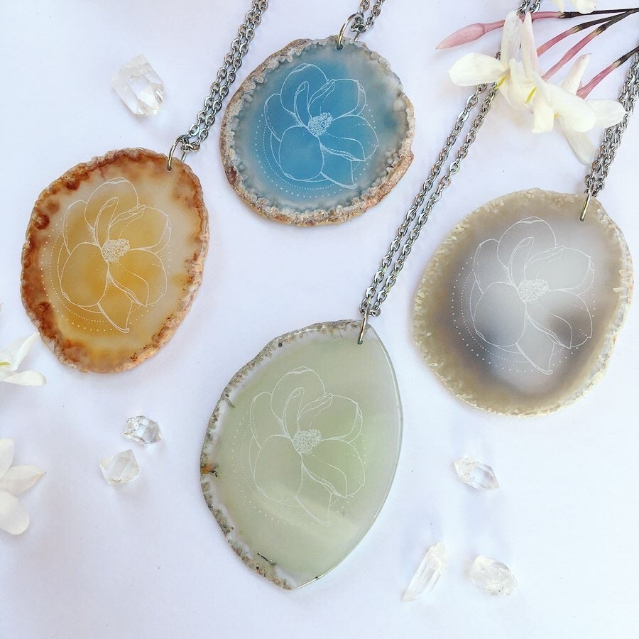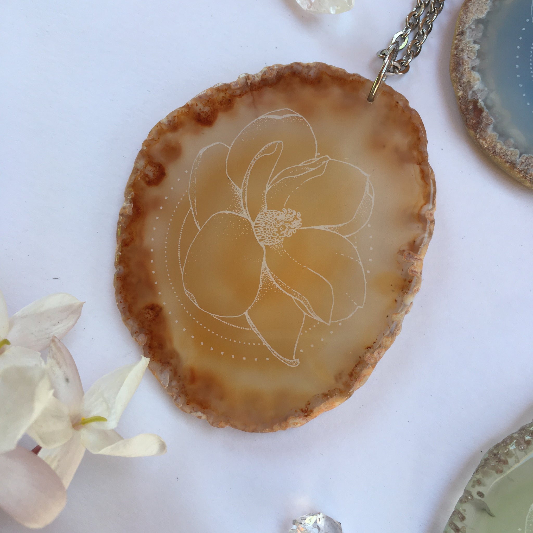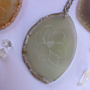 ”Magnolia Matriarch” Magnolia Flower Agate Slice Pendant Necklace - Flower Essence Collection