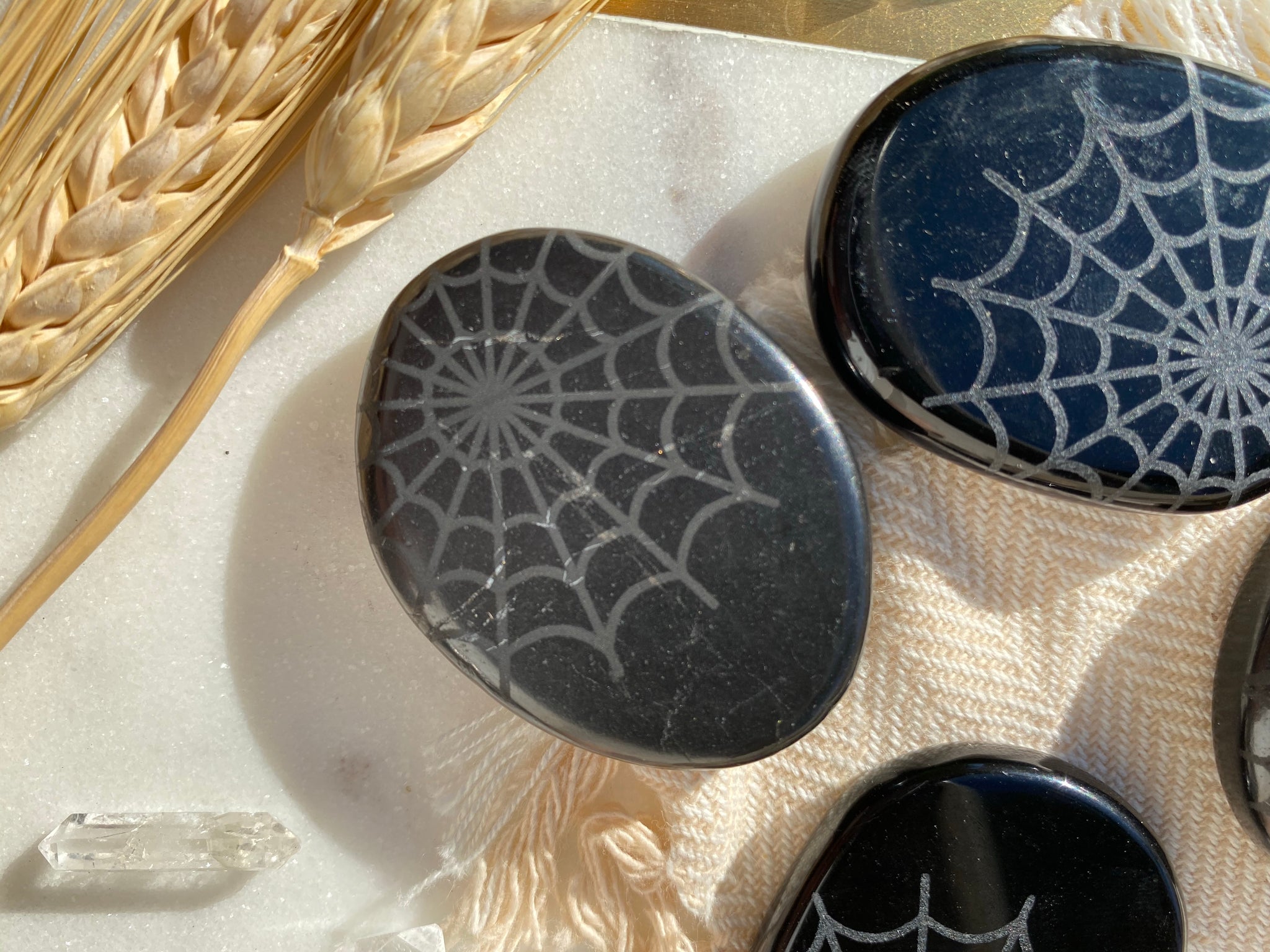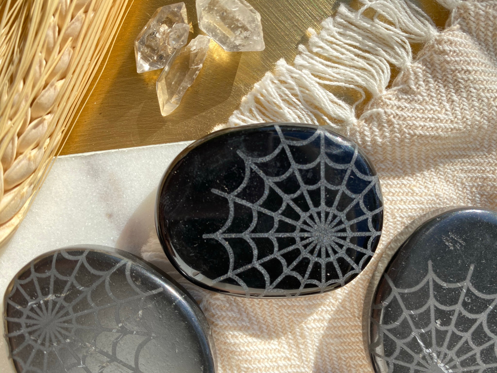 “Cobweb” Spider Web Mandala Engraved Obsidian Worry Stone