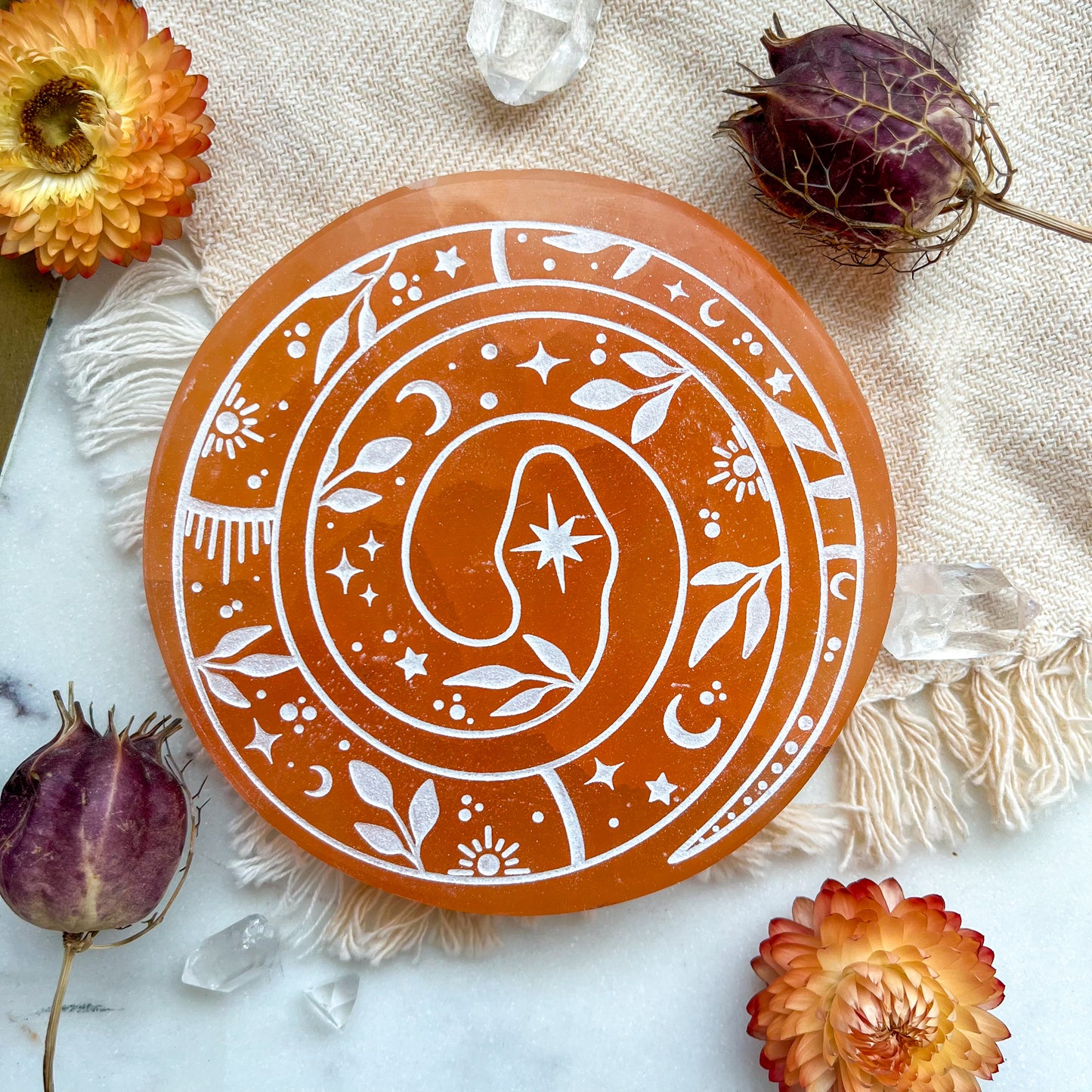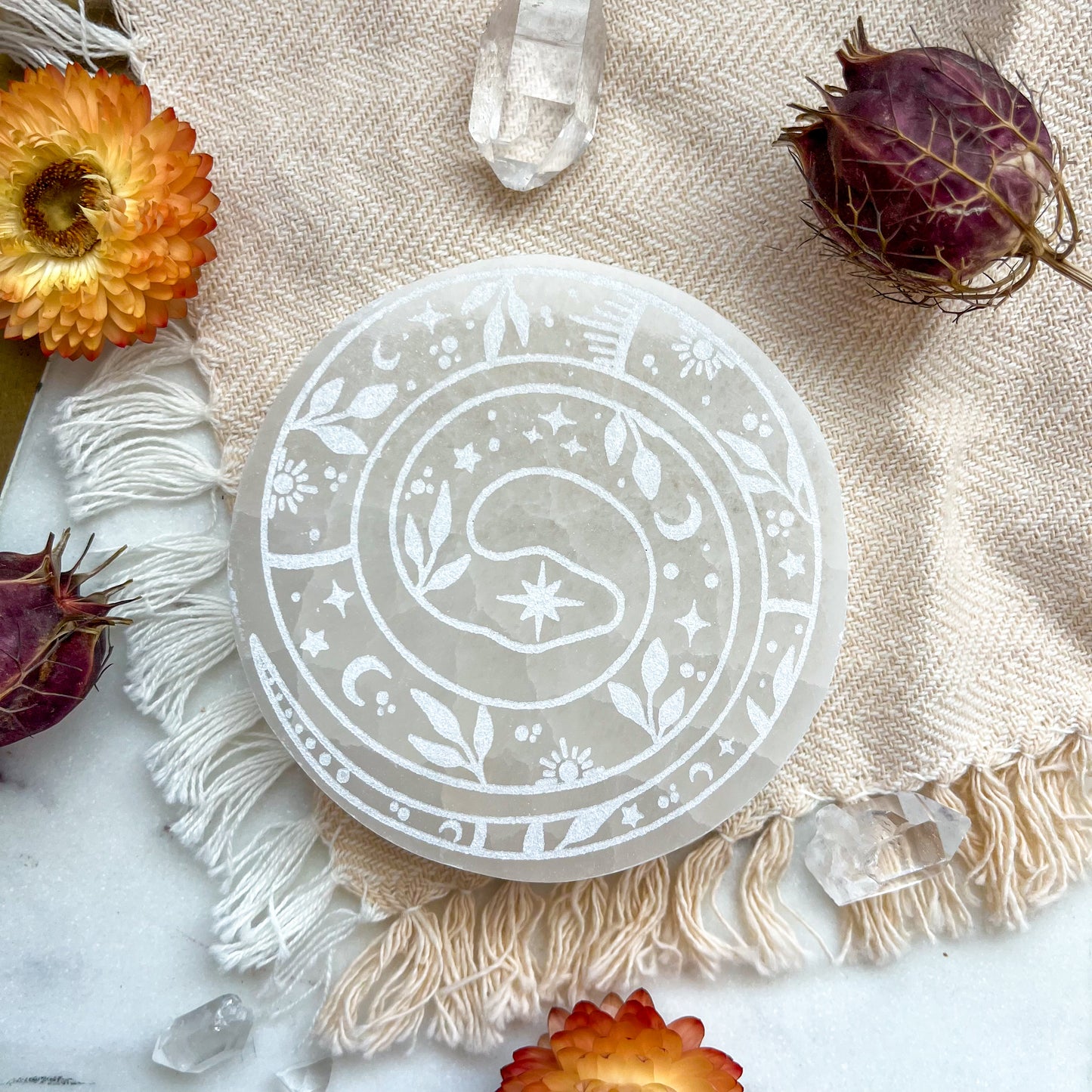 The intricately engraved Celestial Snake adds a magical touch, making this plate a captivating centerpiece for your Halloween decor. Whether you're setting the mood for spooky season or simply embracing the natural beauty of crystals, this charging plate is the perfect addition to your collection.