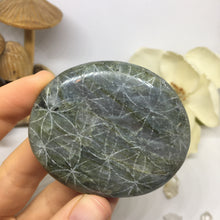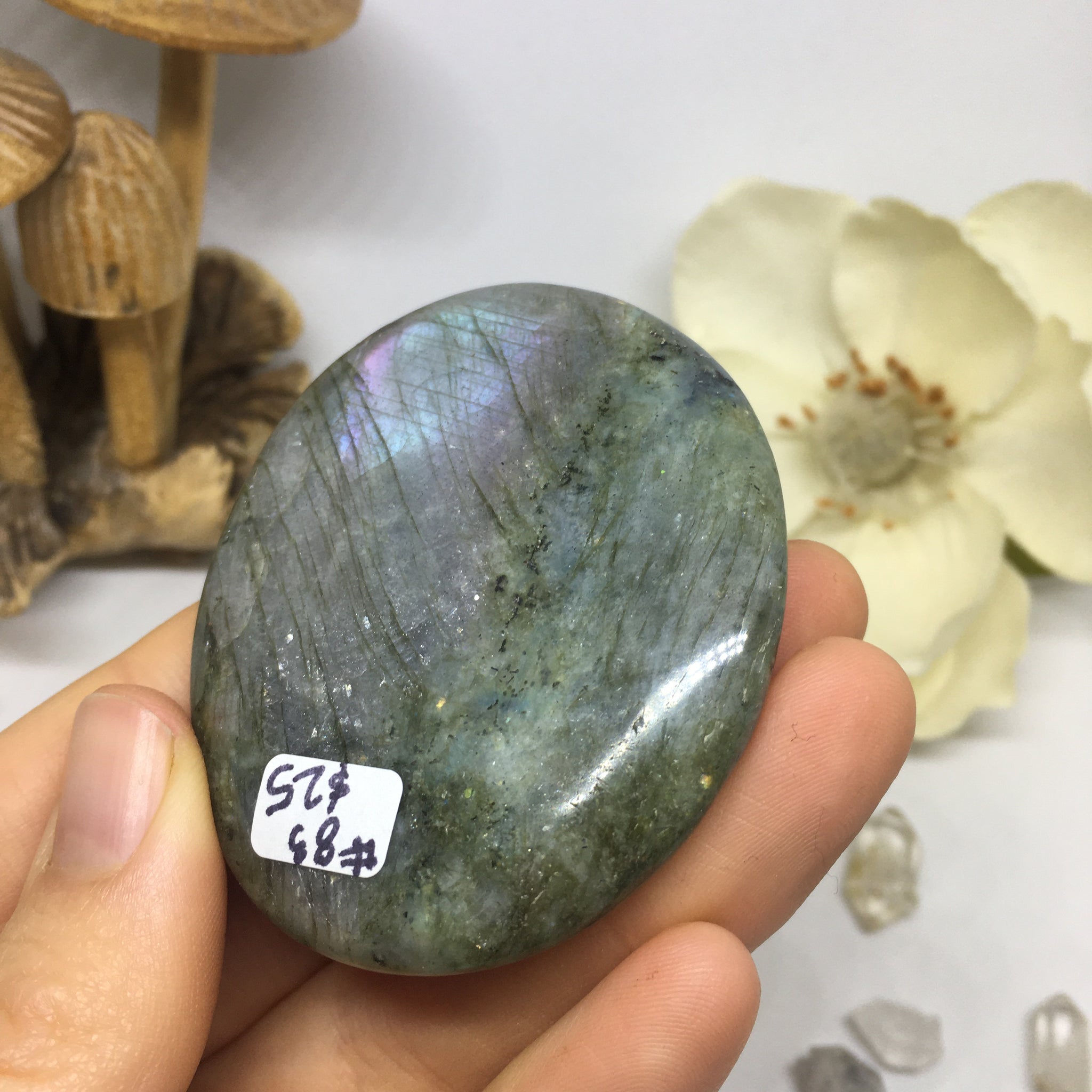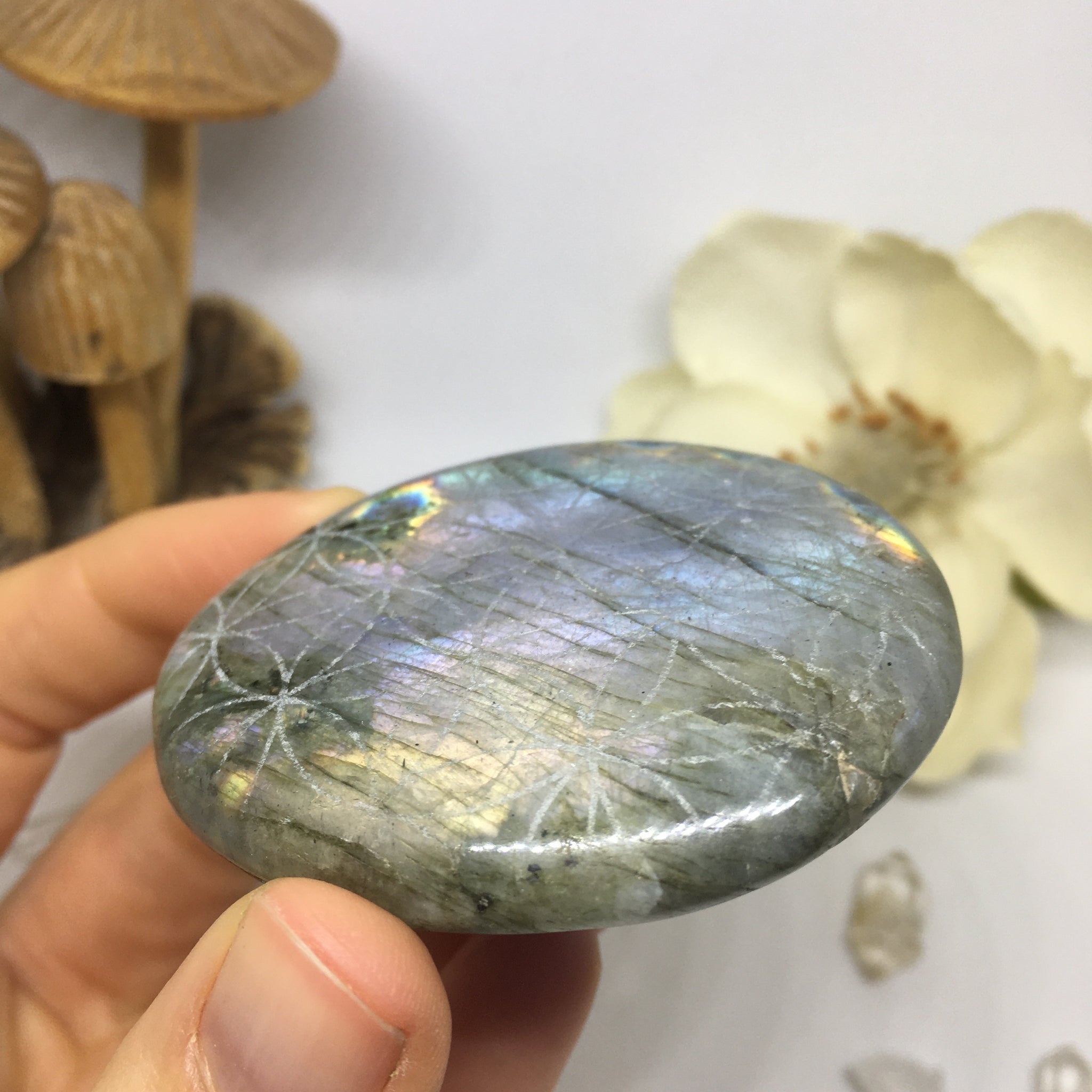 #83 Pastel Pink, gold, and purple Labradorite Palmstone Etched with Flower of Life