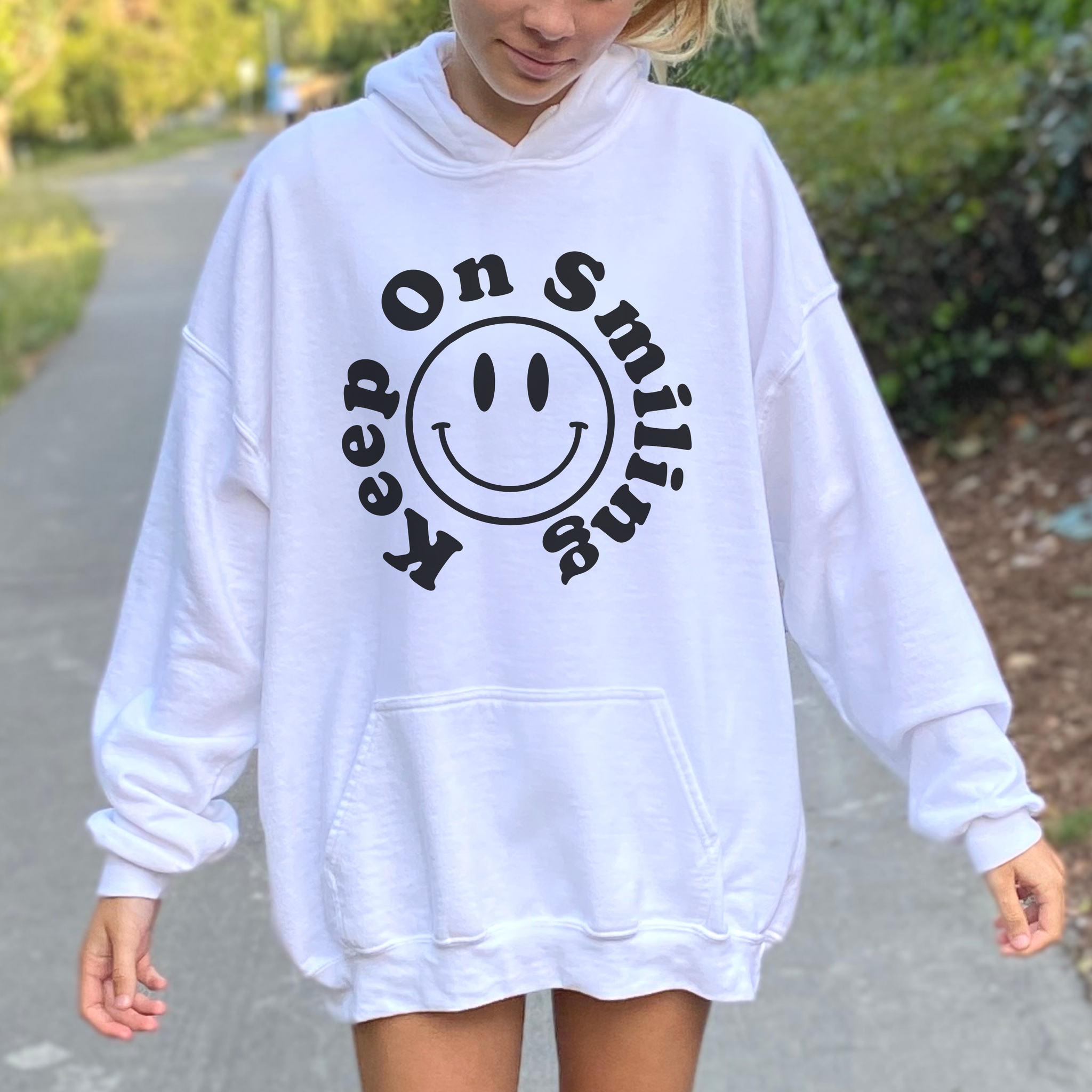 Keep your smile ON with this oversized hoodie sweatshirt that says "Keep on Smiling" in the most adorable fashion. The perfect gift for any fashion-forward girl who likes to keep it simple and smiley. This is especially perfect for any teenage or college vsco girl who loves vintage design and sharing their positive outlook with the world! The words "Keep on Smiling" are printed in a bold, retro font across the front of this hooded sweatshirt. The words are accompanied by a happy face icon that is sure to put a smile on your face every time you wear it! It's so cute and retro, it will make you feel like you're back in '90's—but with a much better sense of style. It's perfect for rocking on those cooler days, but we love it even more for pepping us up when we're feeling low. You've got a lot to smile about. And we're here to help you keep on smiling!