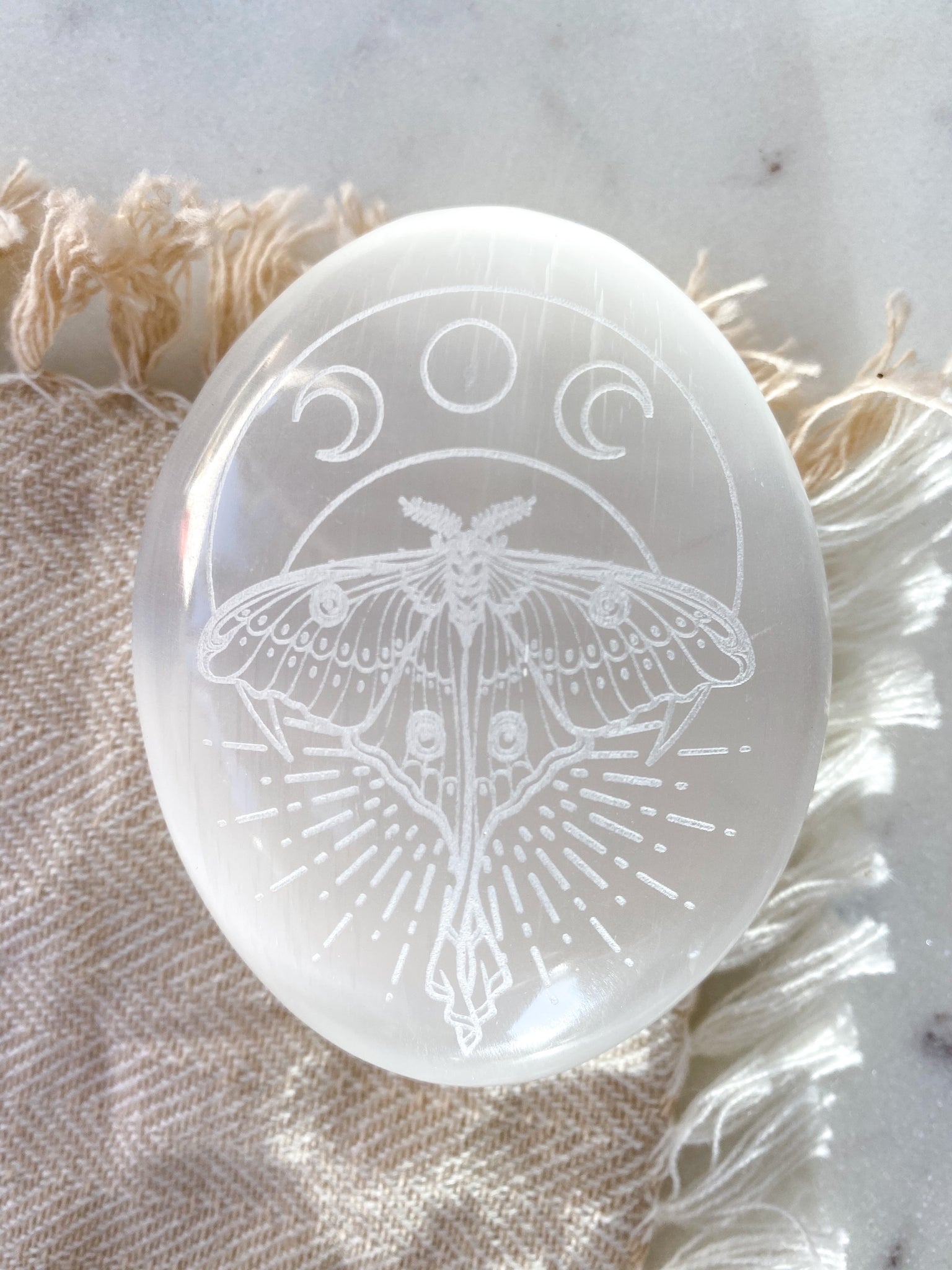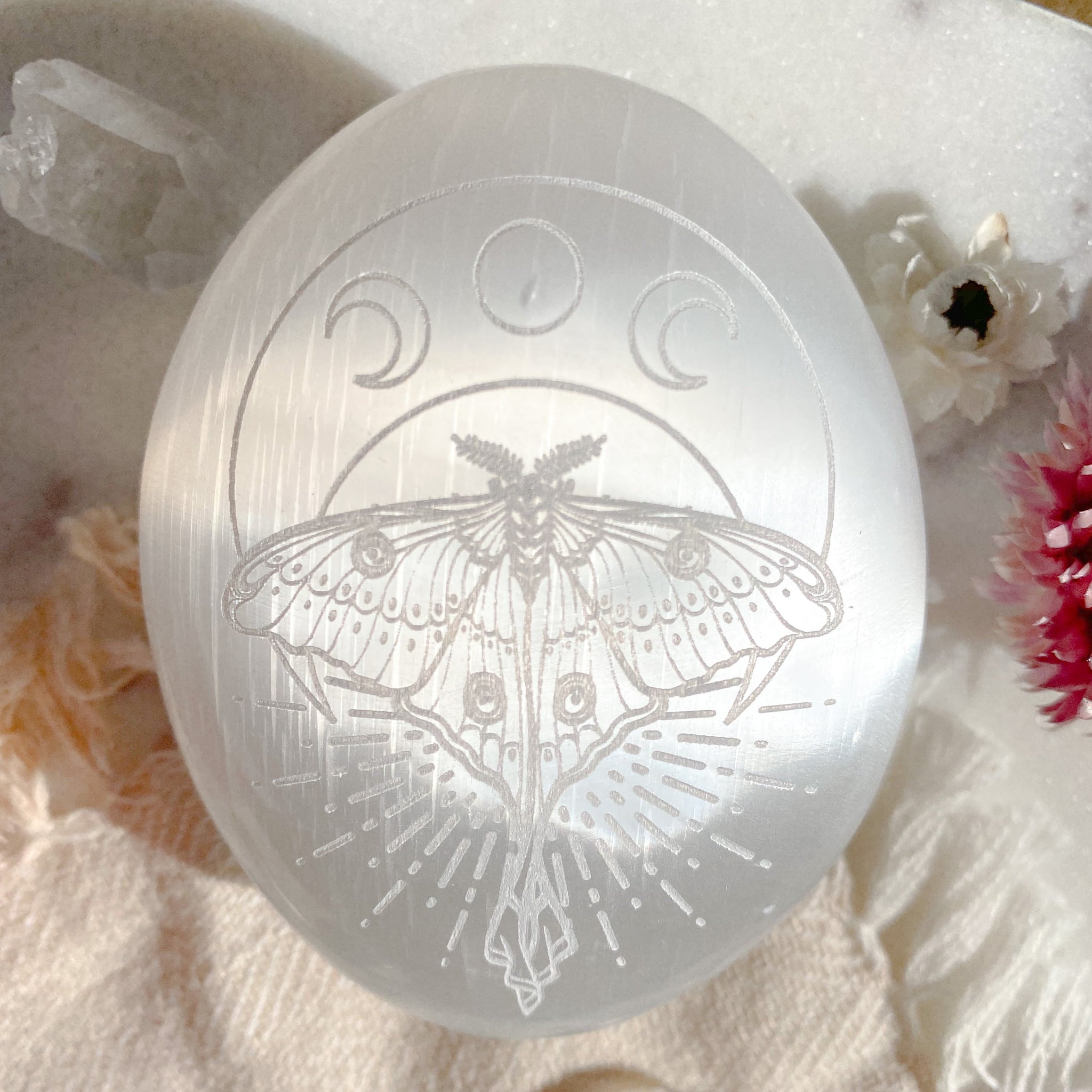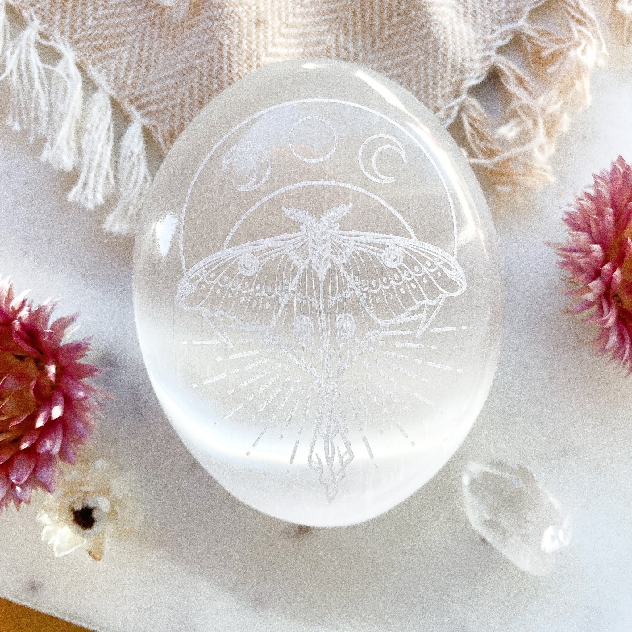 Etched Selenite Palmstone "Mystic Luna Moth"