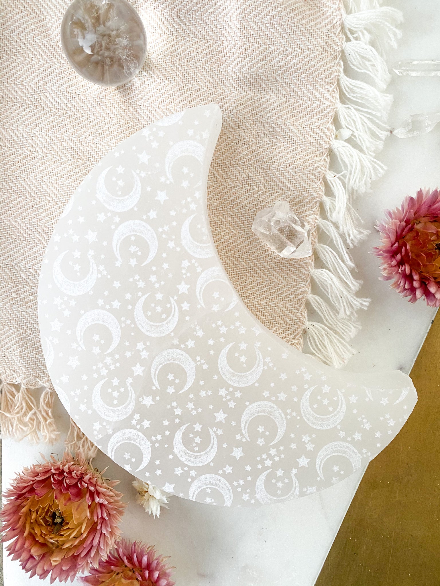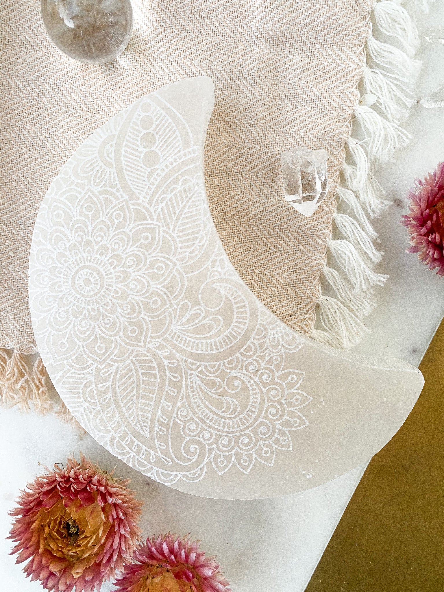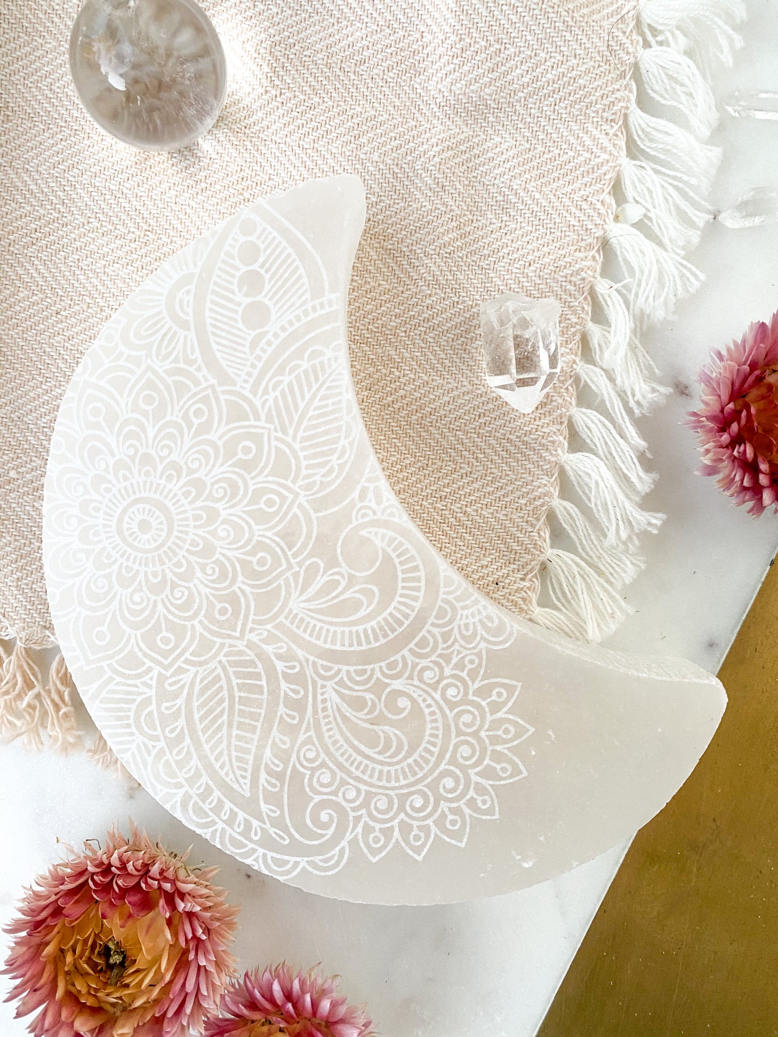 These gorgeous, extra thick selenite crescent moons are engraved with your choice of 4 designs. These make the perfect addition to your altar where you can display and charge your crystals in style!