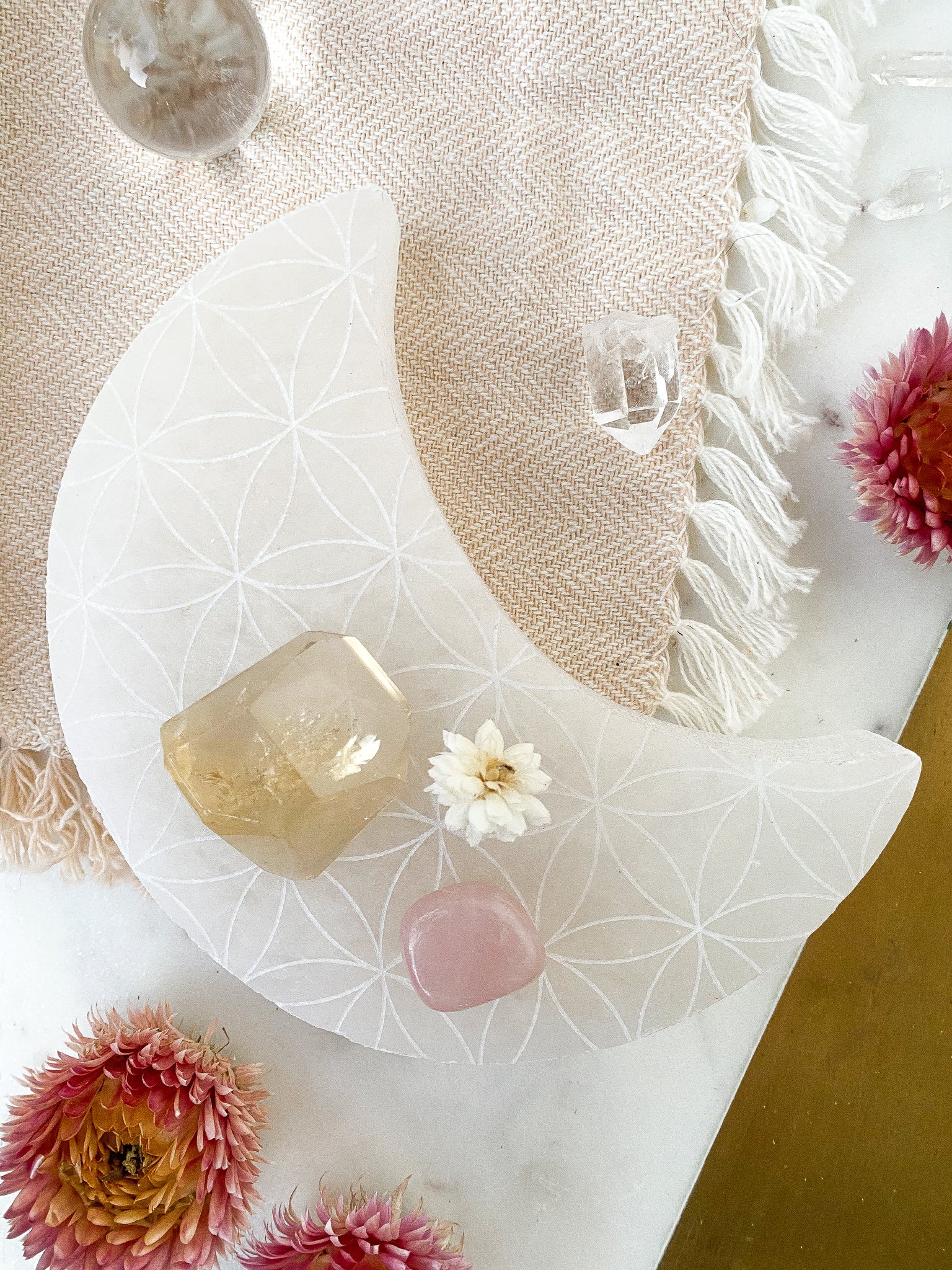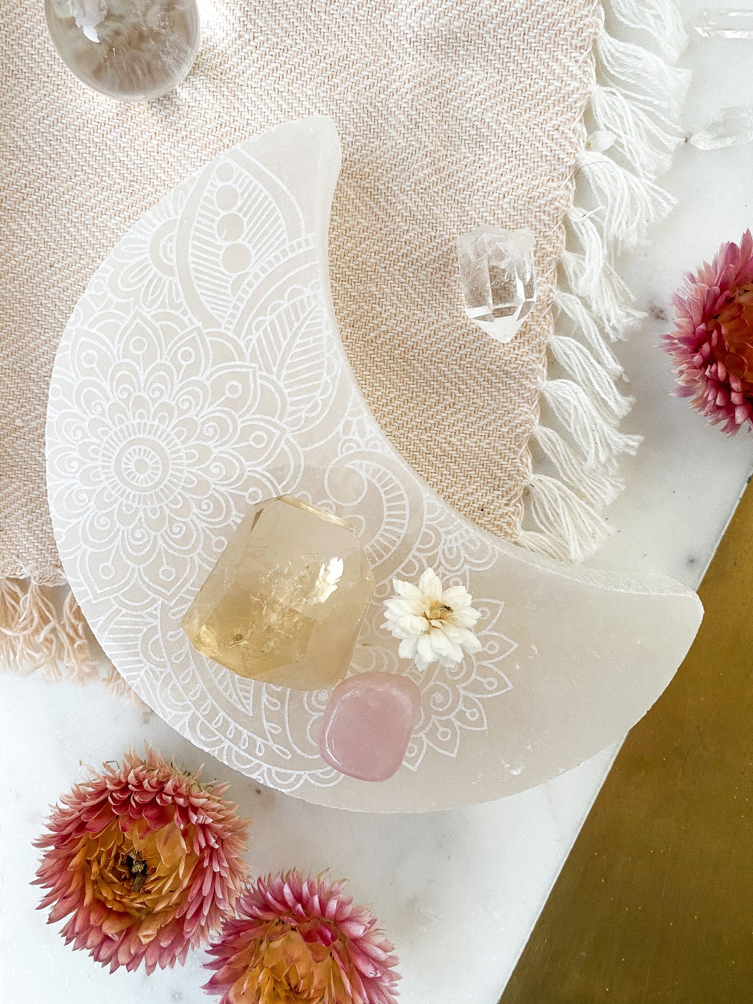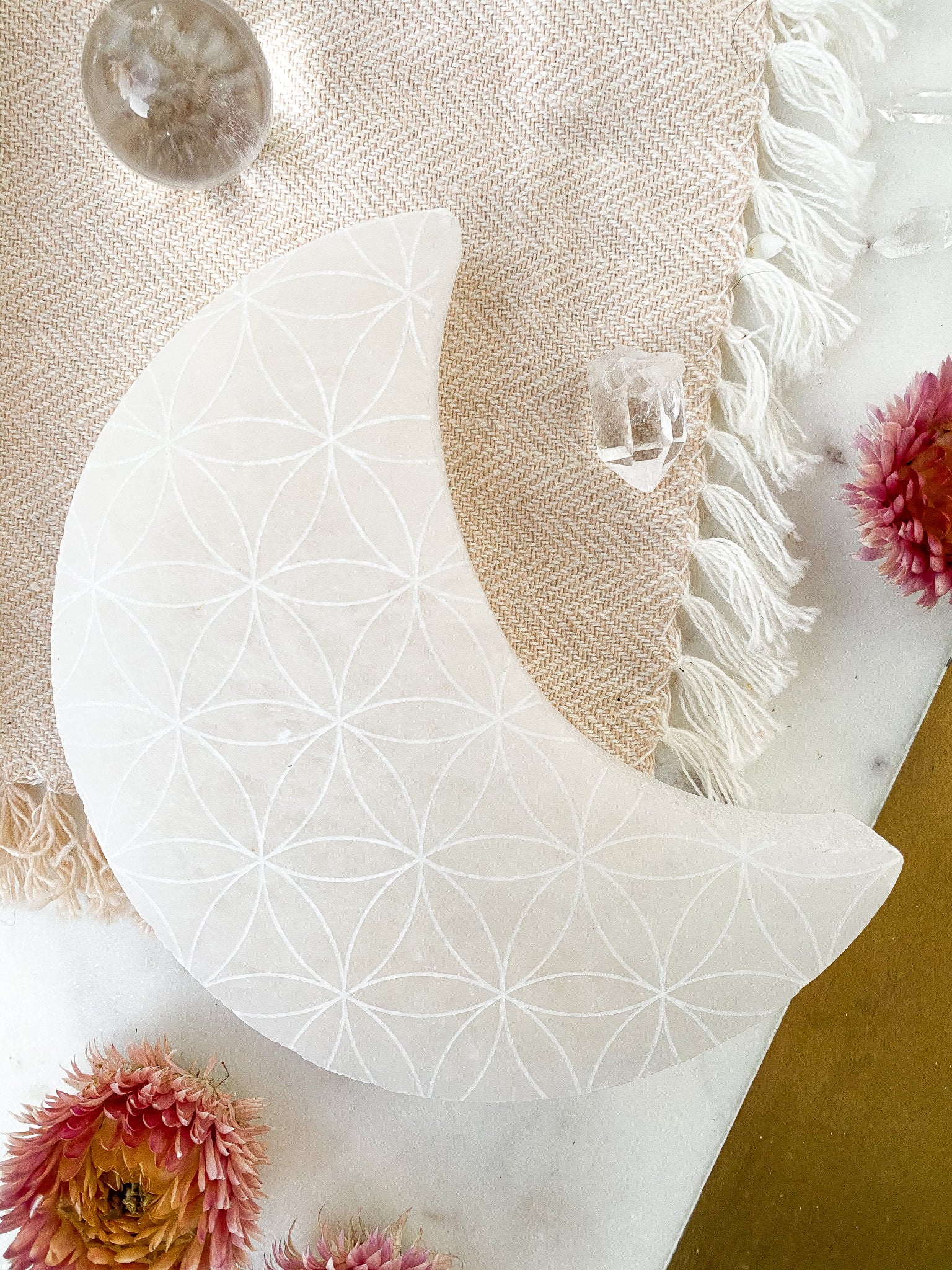 These gorgeous, extra thick selenite crescent moons are engraved with your choice of 4 designs. These make the perfect addition to your altar where you can display and charge your crystals in style!