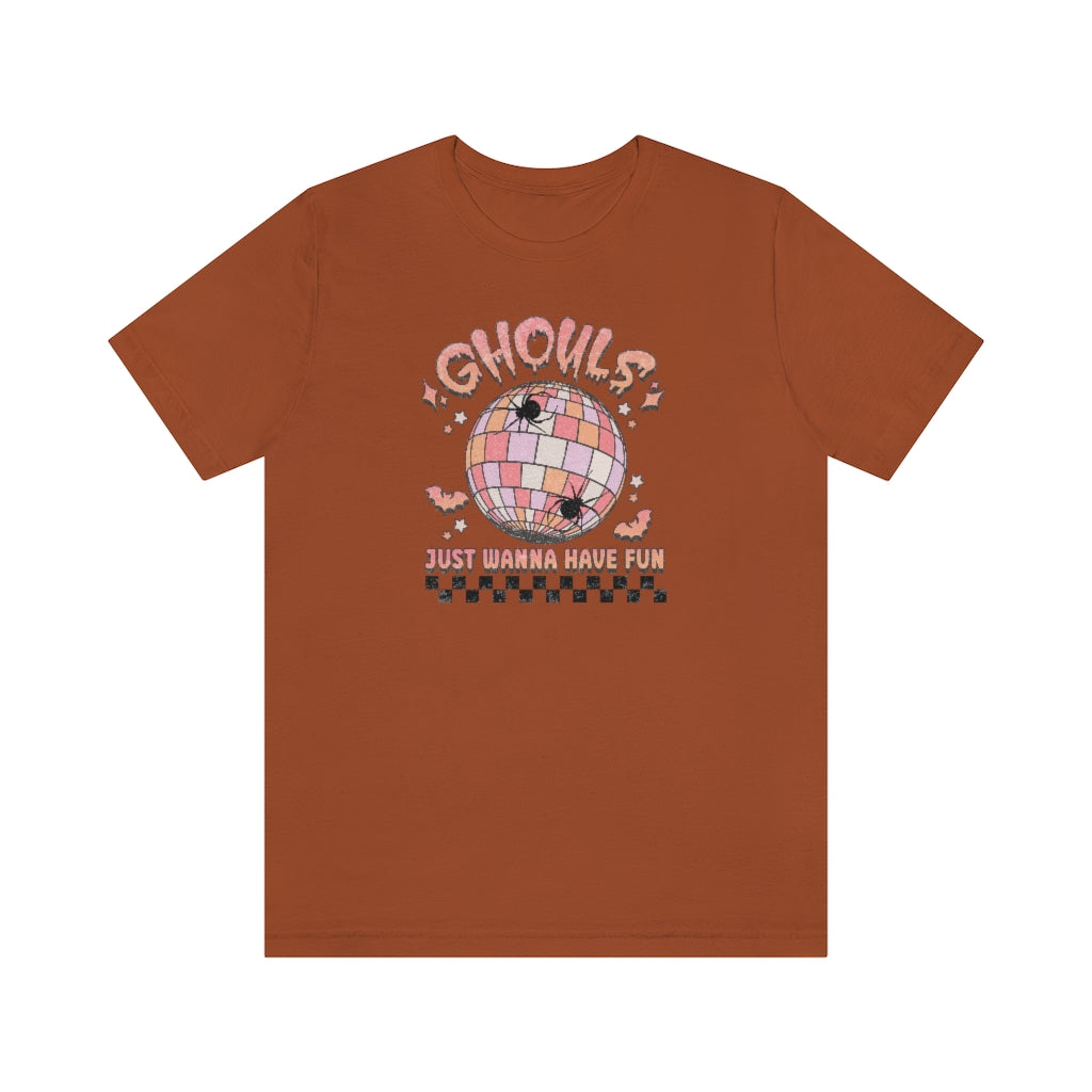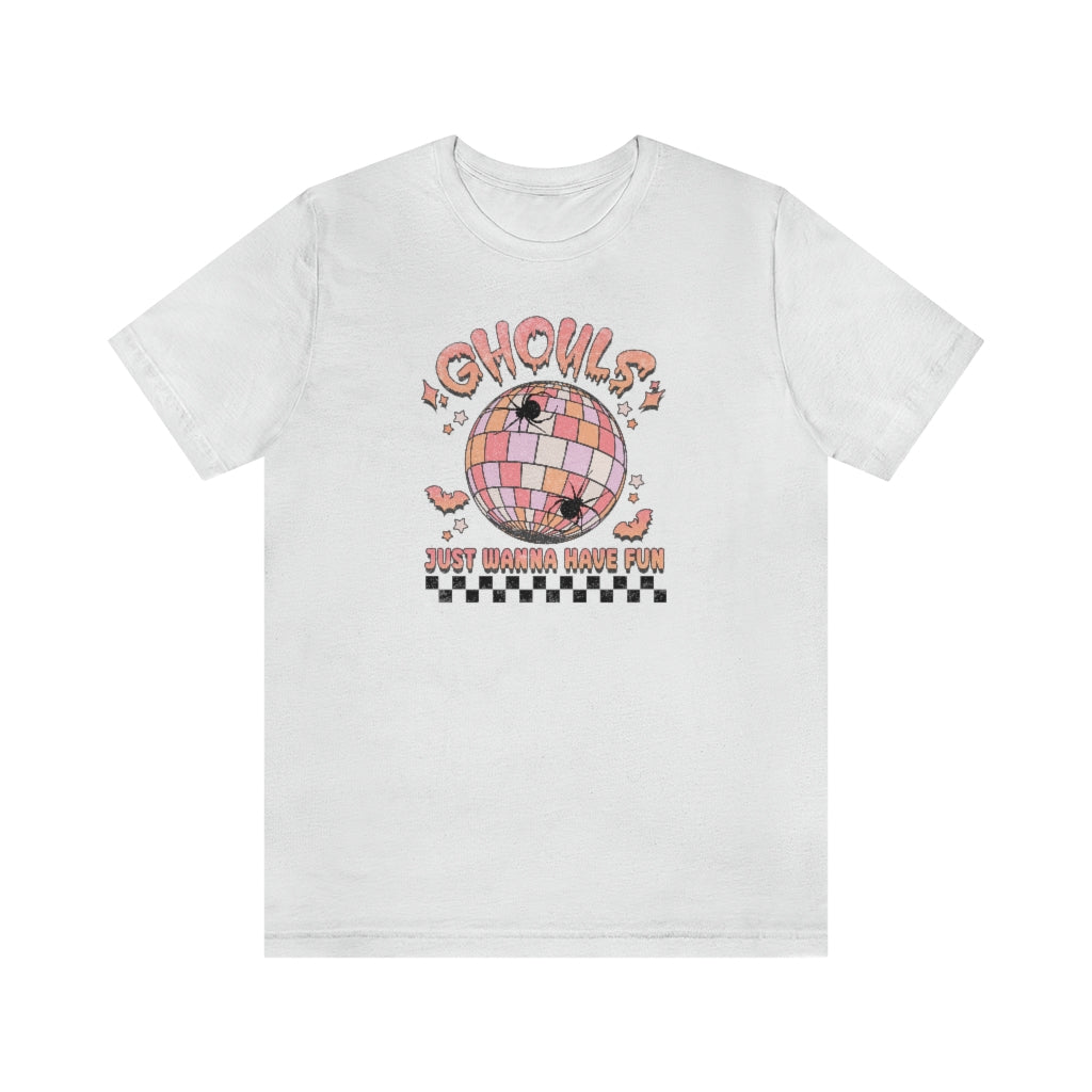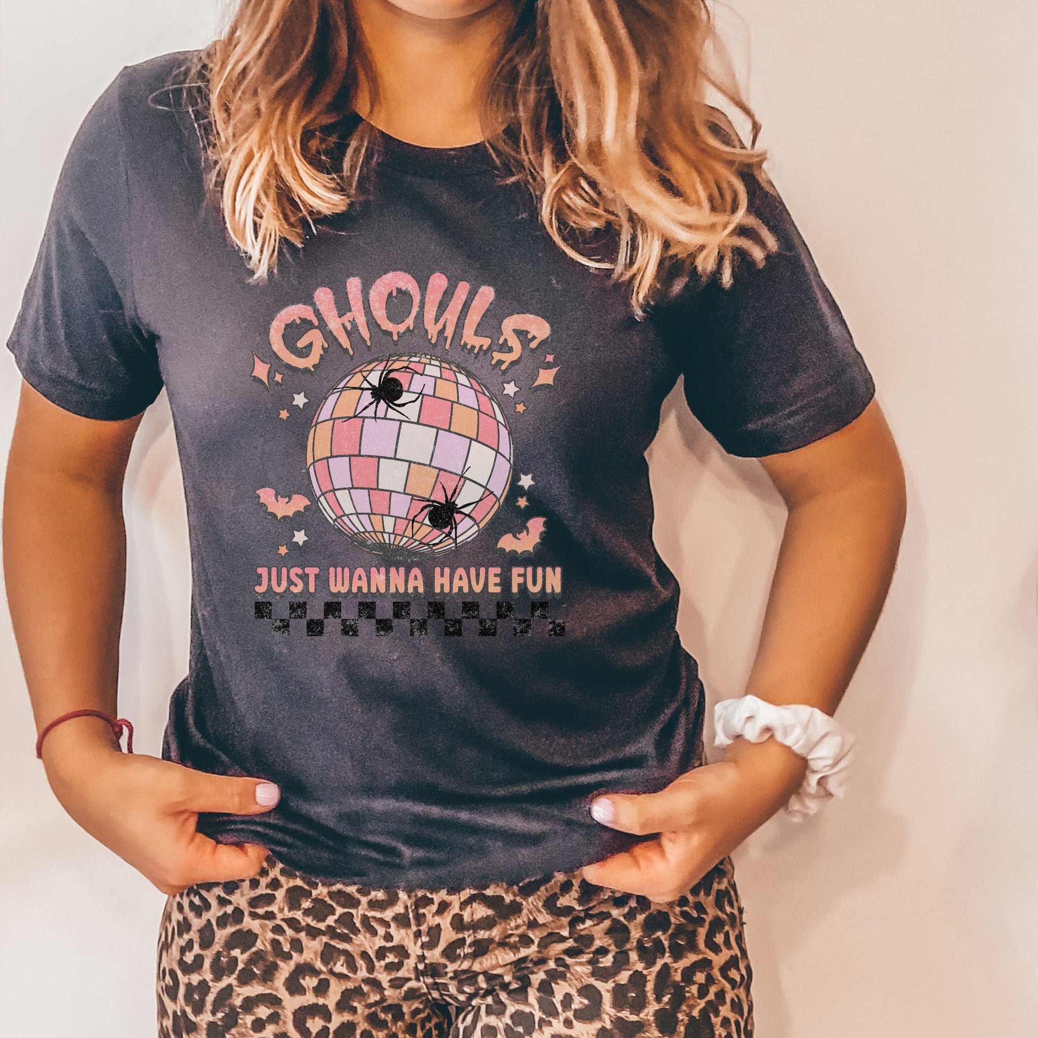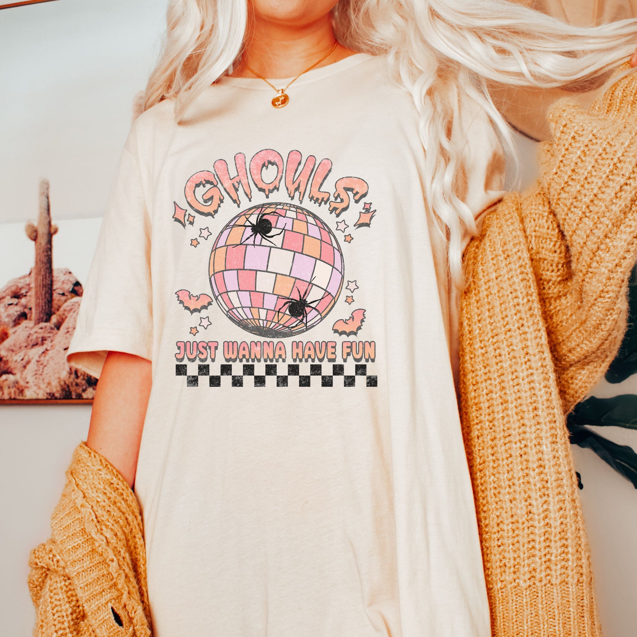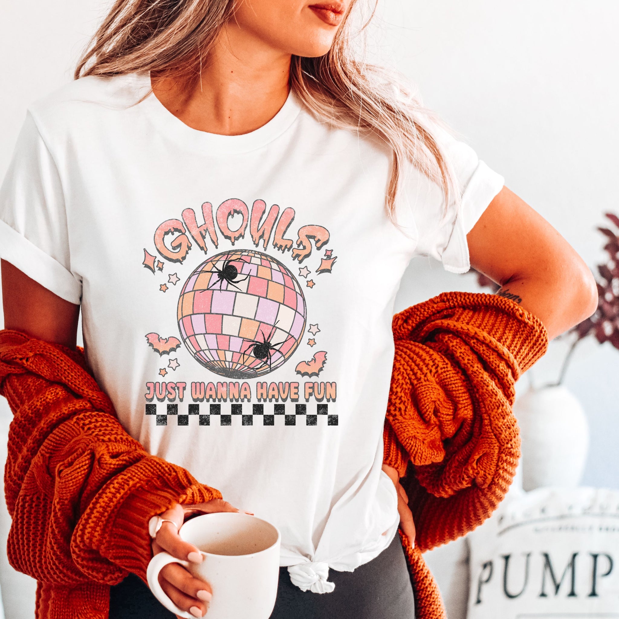 Stay Spooky all Halloween season long with this adorable t shirt featuring a disco ball and "Ghouls just wanna have fun!" In a colorful retro font, accented by pumpkins, bats and ghosts.
