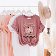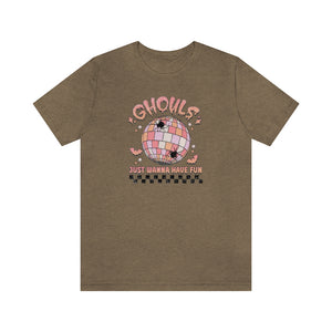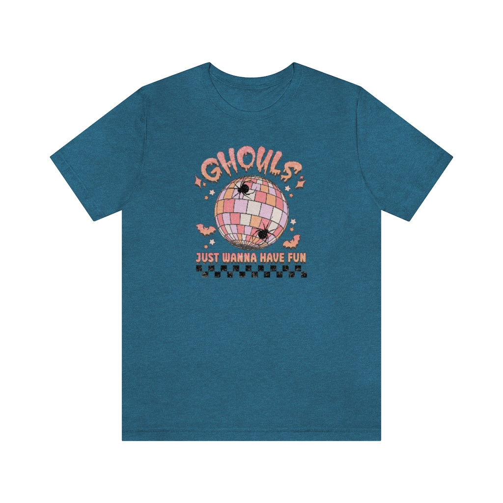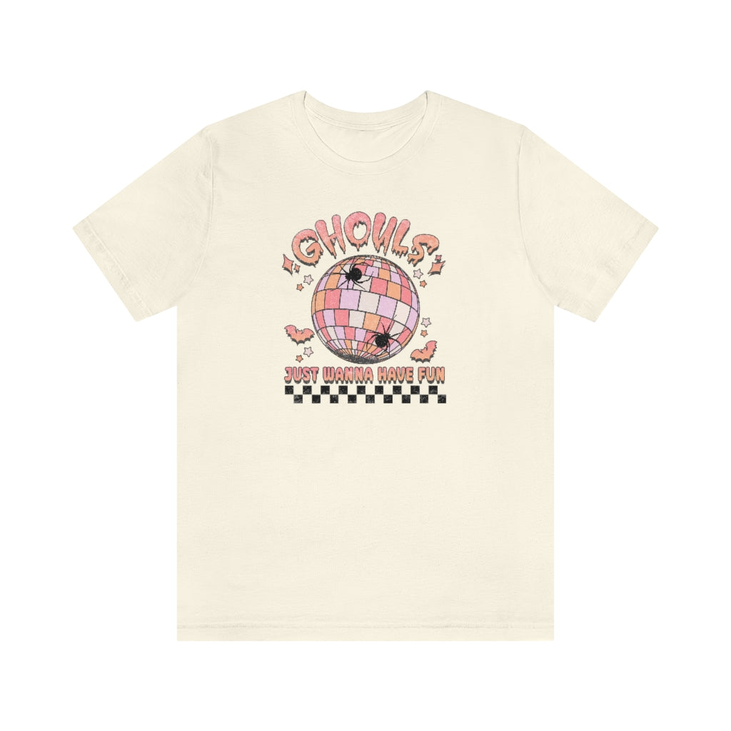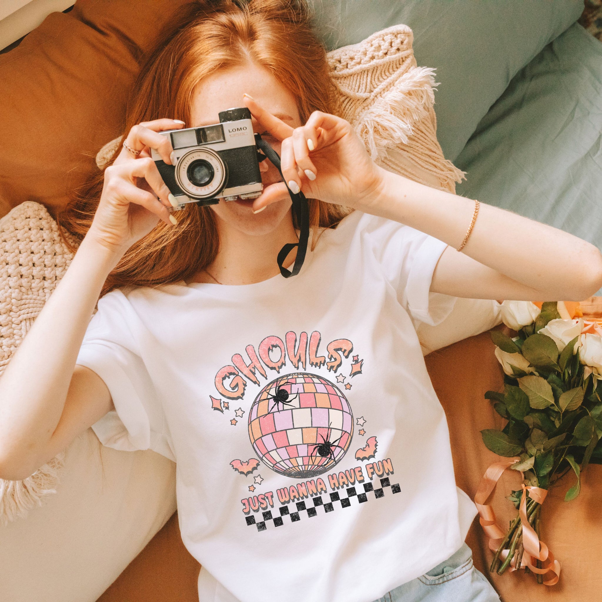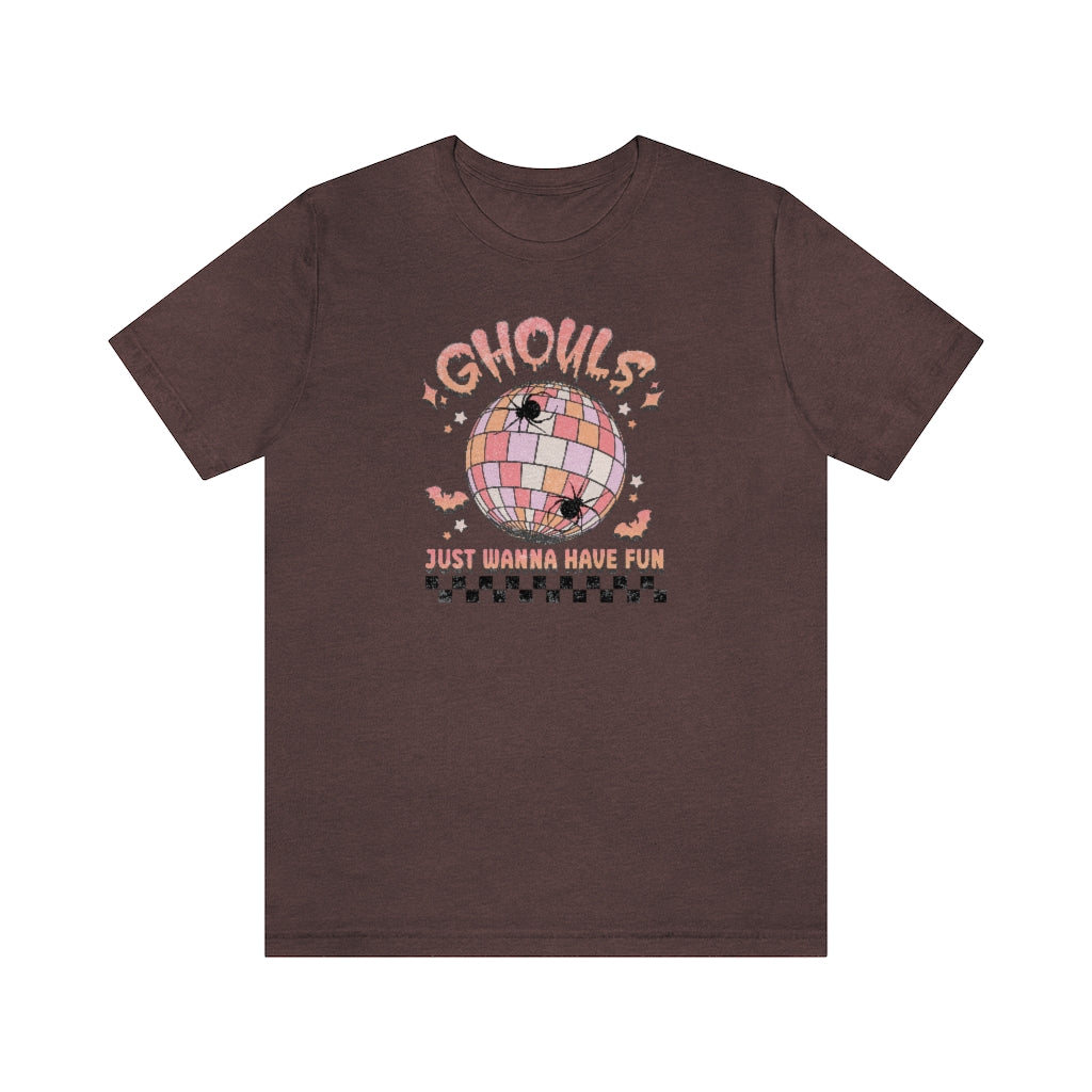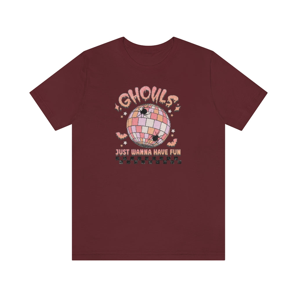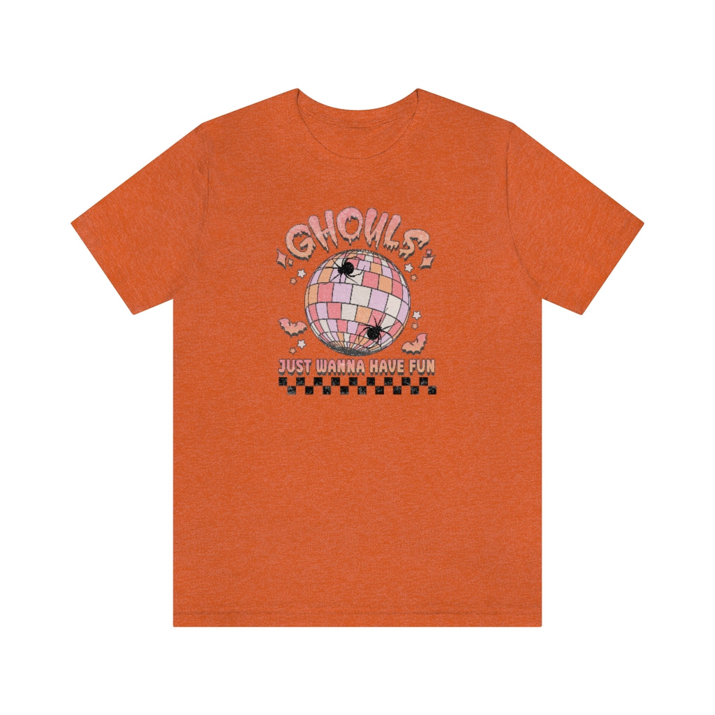 Stay Spooky all Halloween season long with this adorable t shirt featuring a disco ball and "Ghouls just wanna have fun!" In a colorful retro font, accented by pumpkins, bats and ghosts.