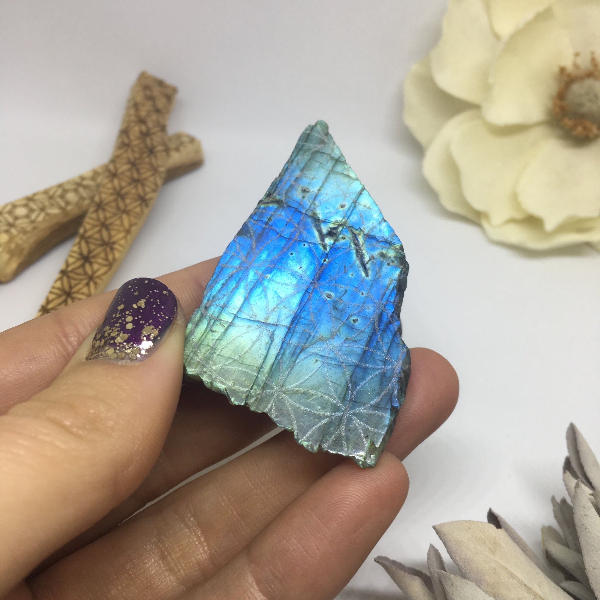 Intuitively Selected High Flash Electric Blue Half-Polished Labradorite Etched with Flower of Life Sacred Geometry 10