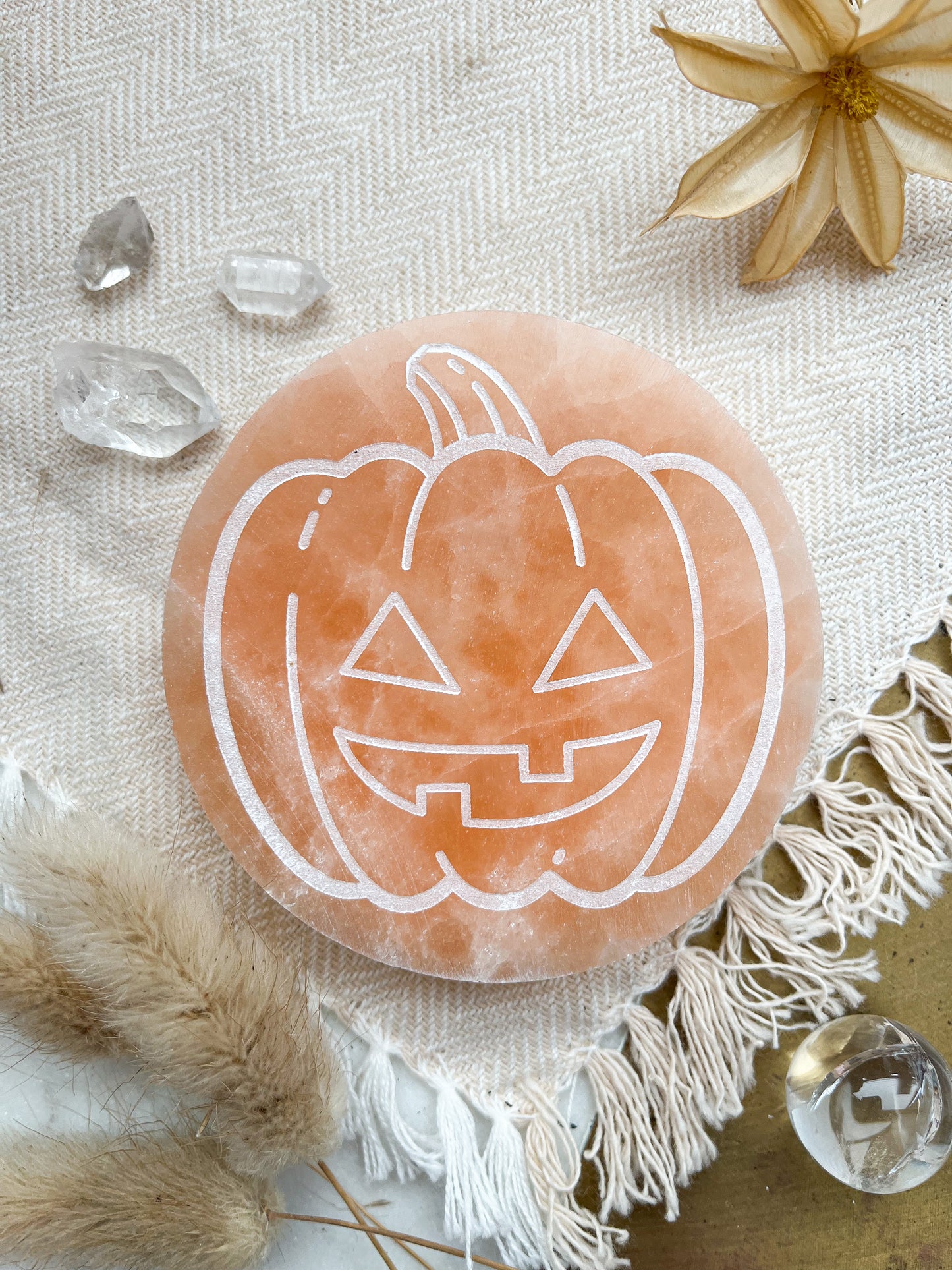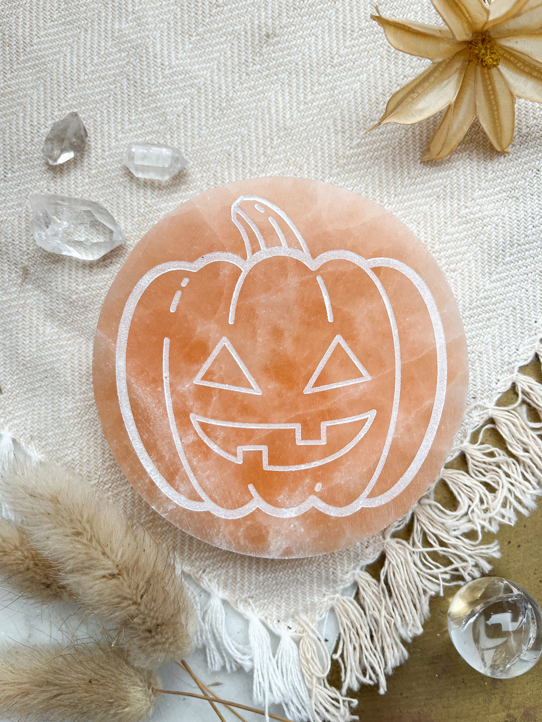 "Jack o Lantern" Pumpkin Selenite Cleansing & Charging Plate and Crystal Grid