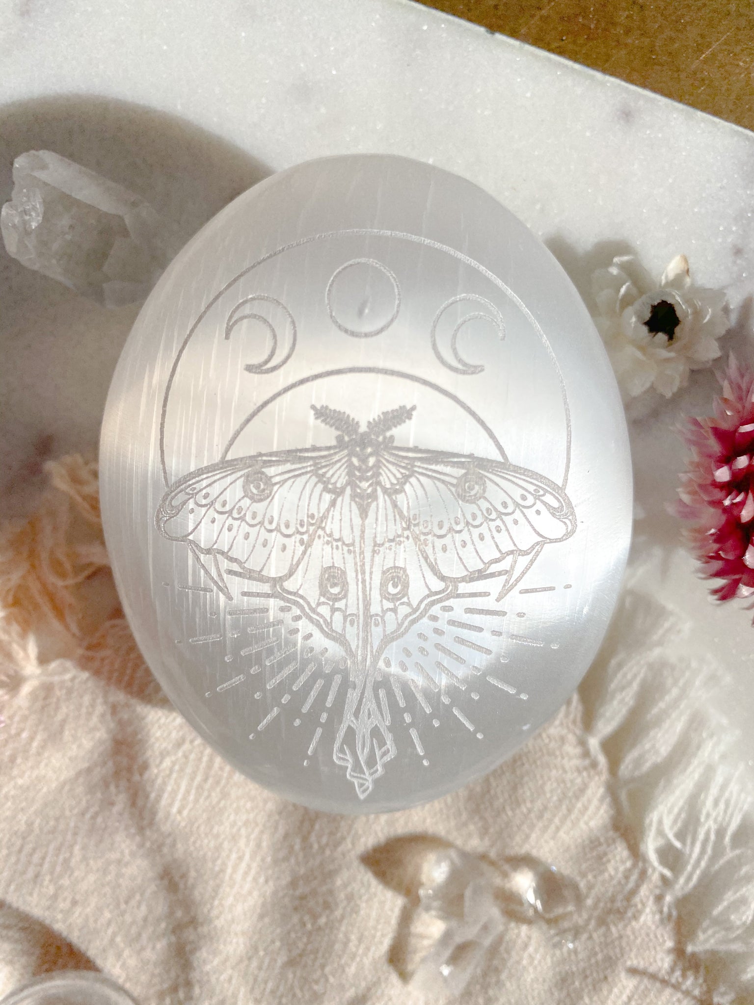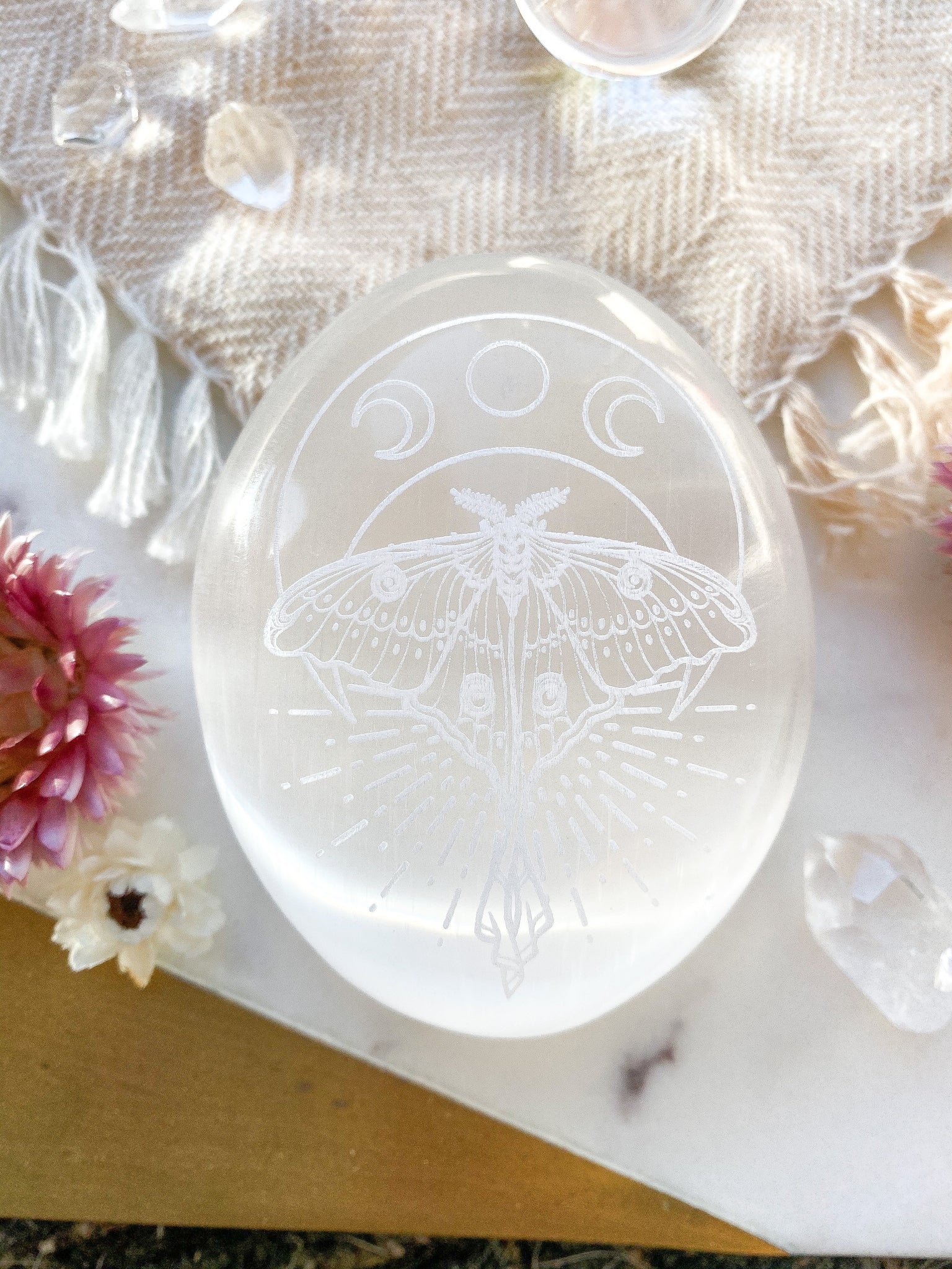 "Mystic Luna Moth" Etched Selenite Palmstone *CLEARANCE or 2ND QUALITY* - FINAL SALE
