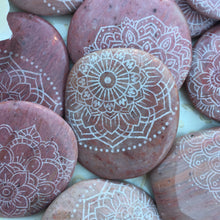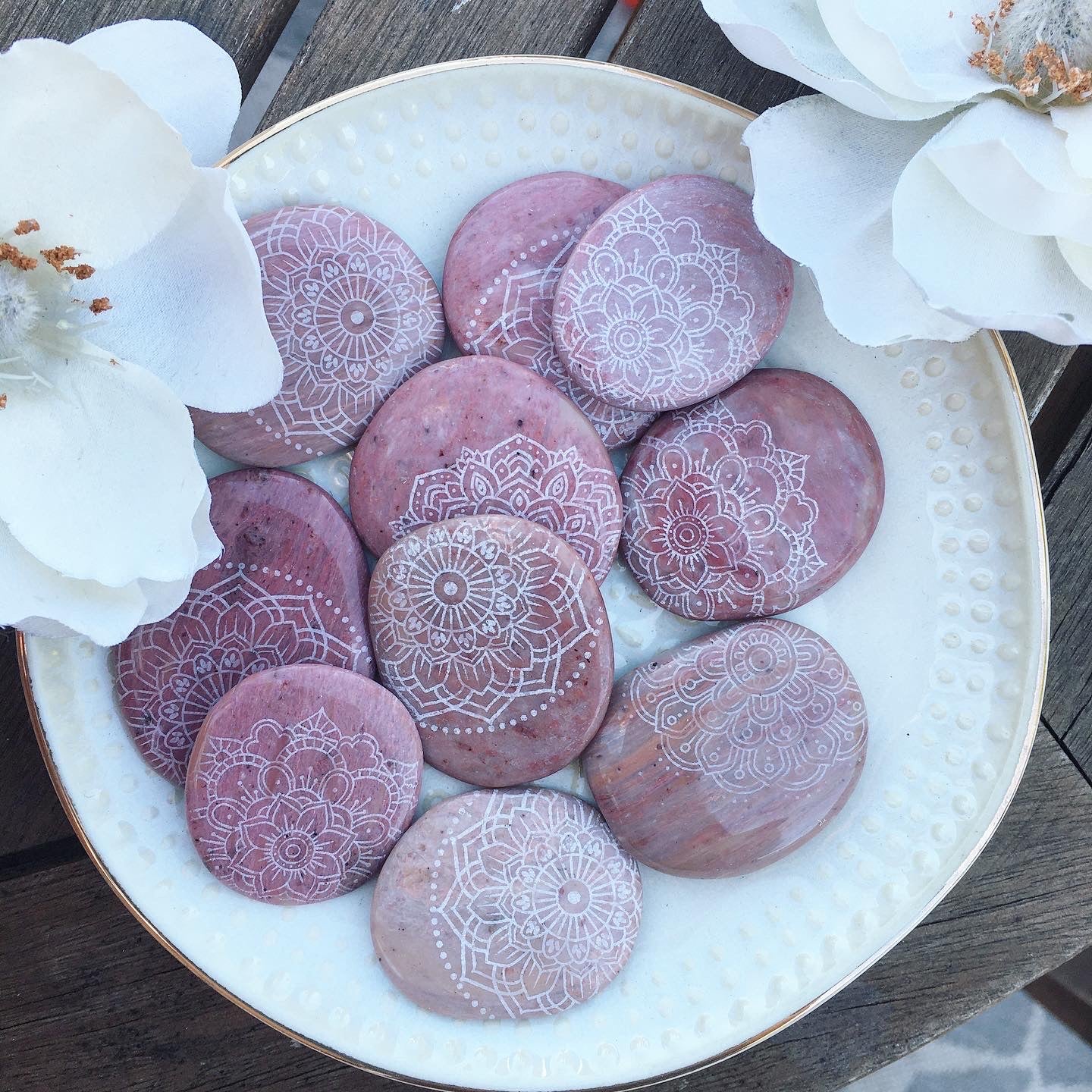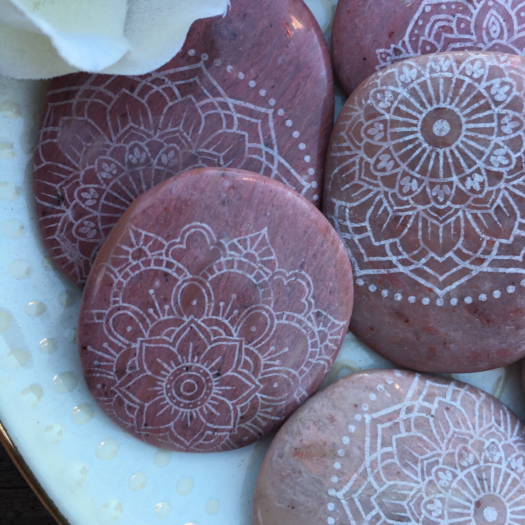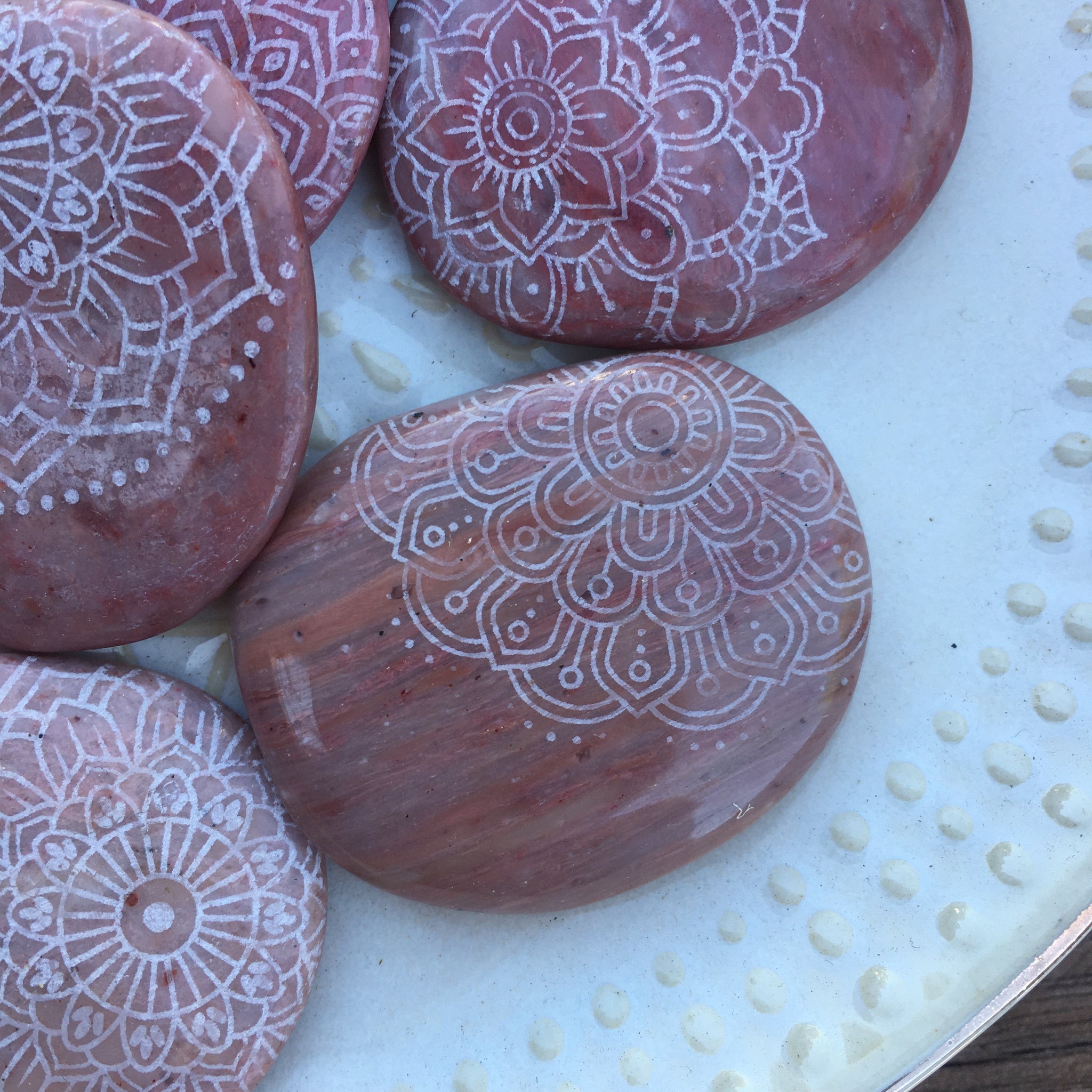 Rare Pink Petrified Wood Palmstone Etched with Mandala, Henna, Or Sacred Geometry