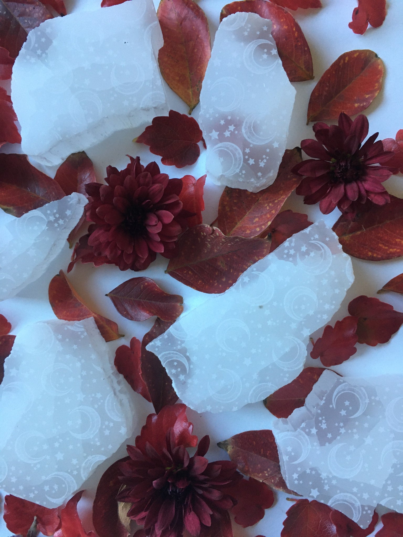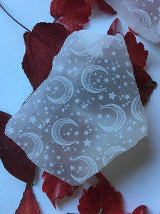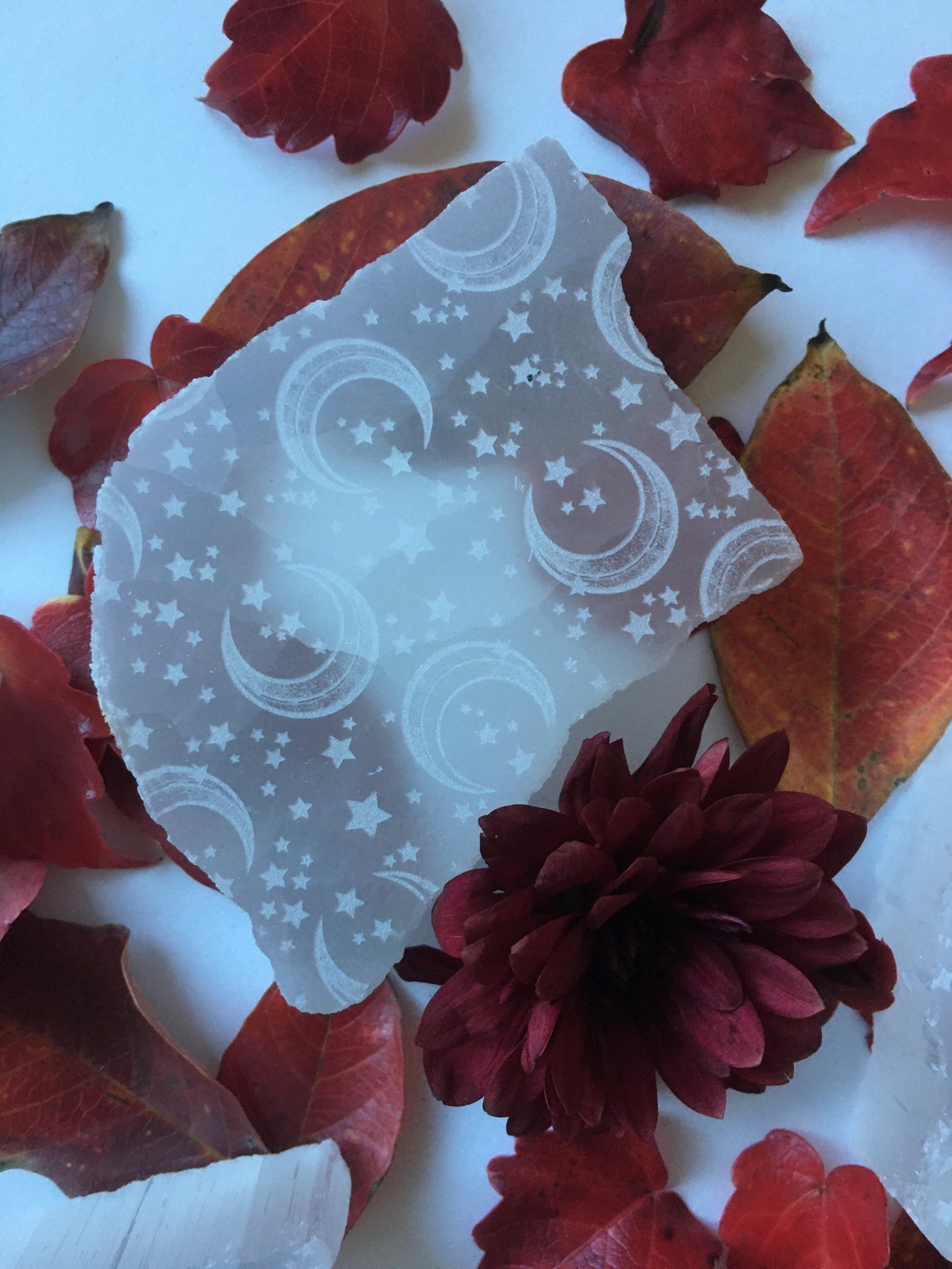 Beautiful selenite shaped into a crescent moon, etched with flower of life sacred geometry.