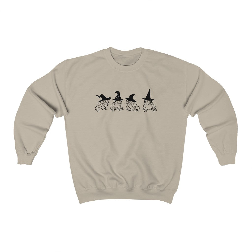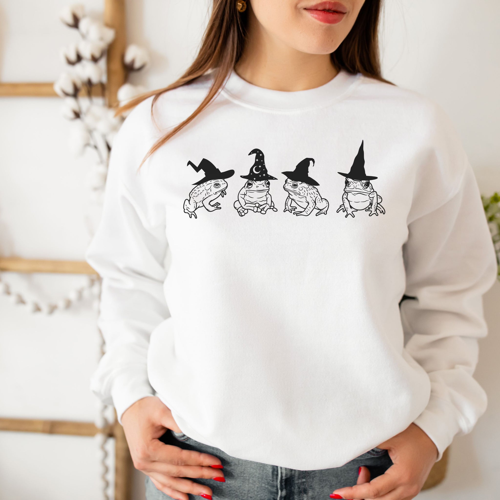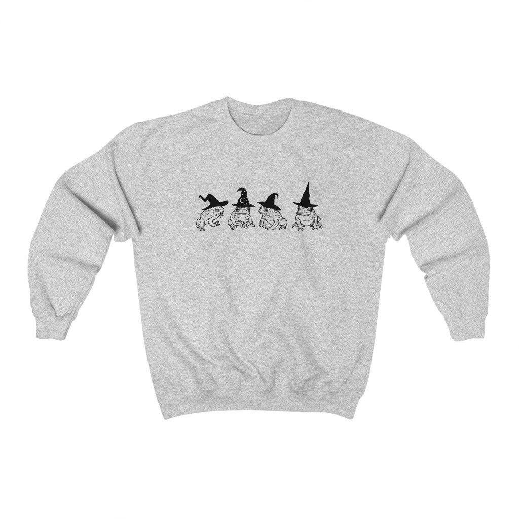 Stay Spooky all Halloween season long with this adorable oversized crewneck sweatshirt featuring 4 toad frogs wearing pointy witches hats.