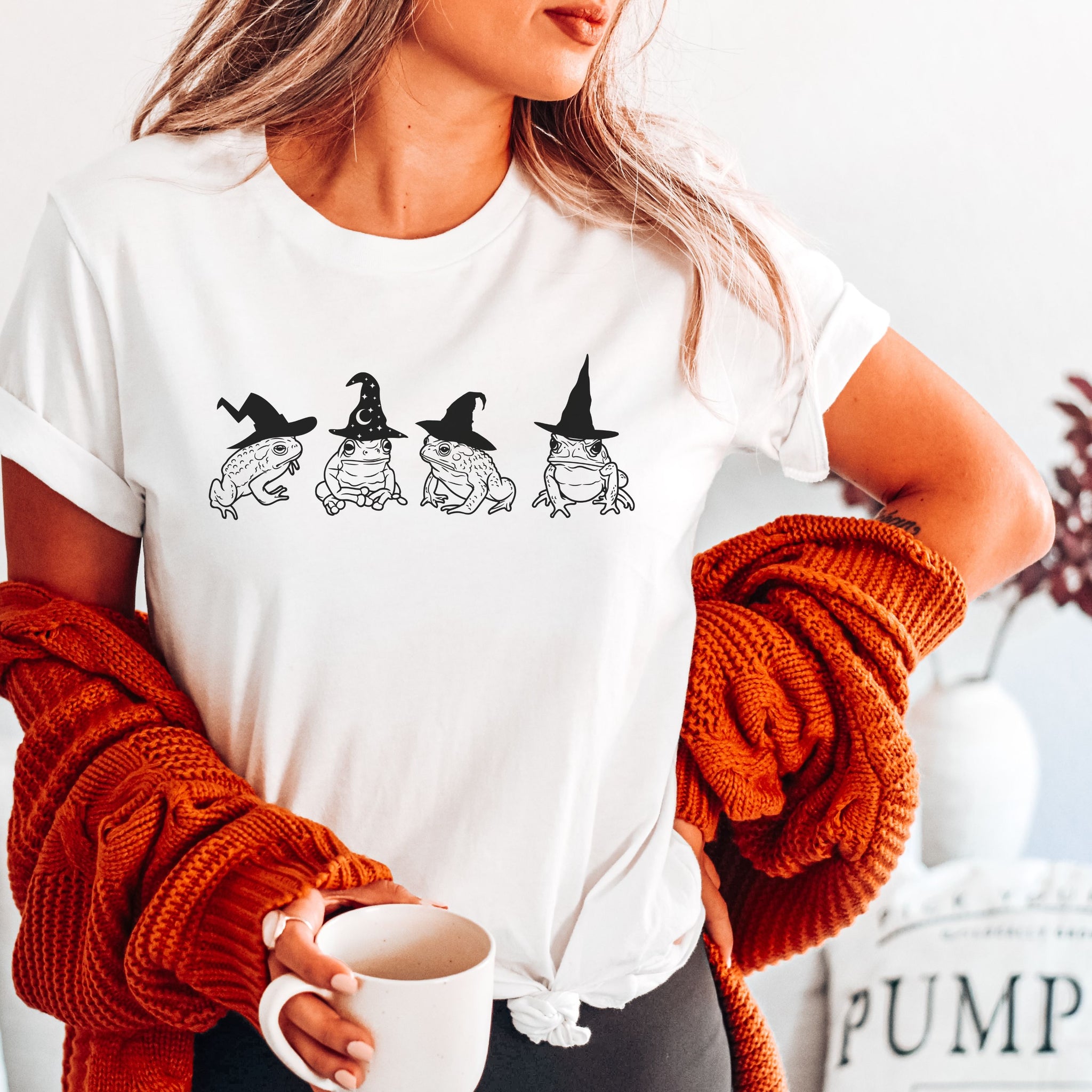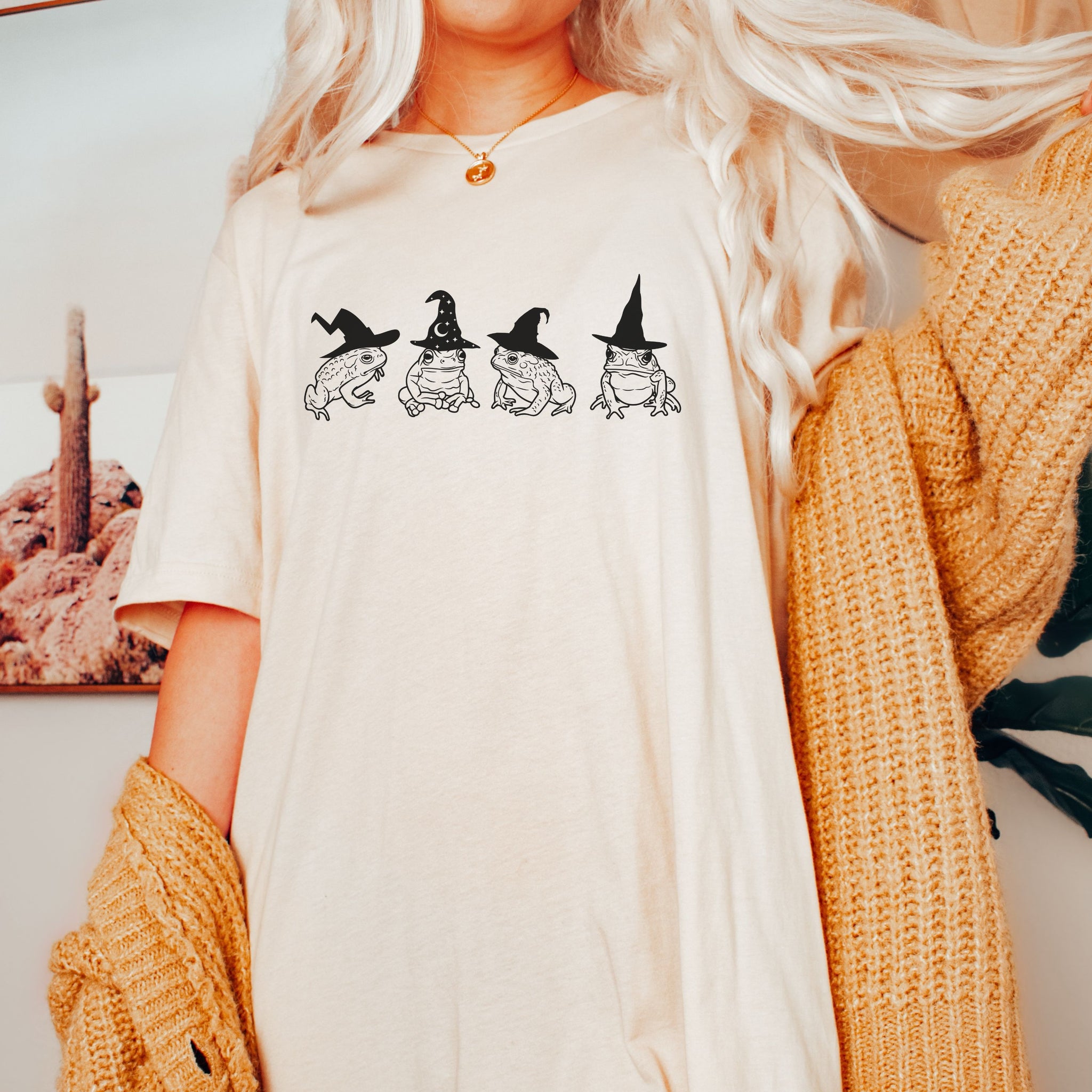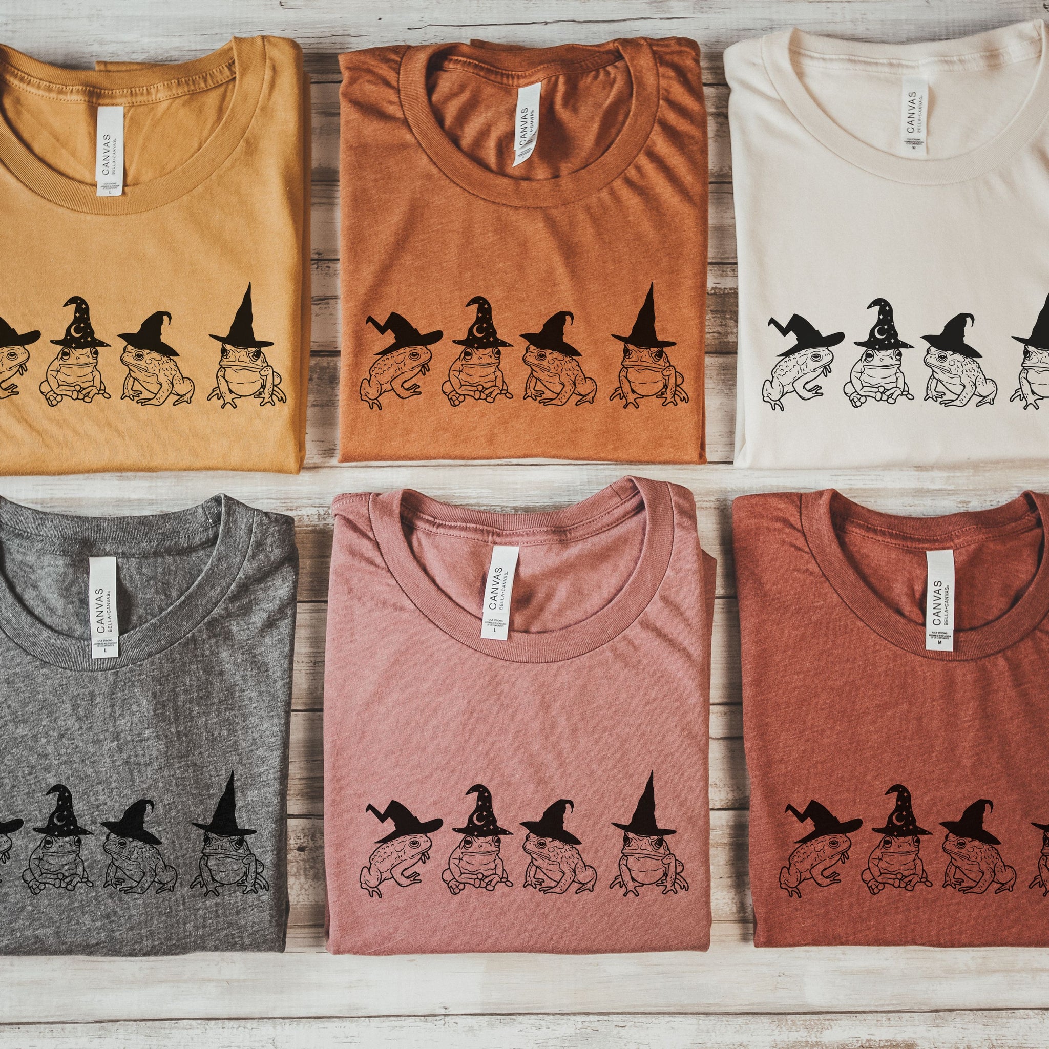 Stay Spooky all Halloween season long with this adorable t shirt featuring 4 witchy toad frogs wearing witches hats.