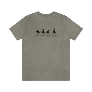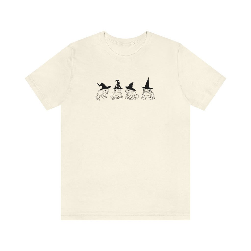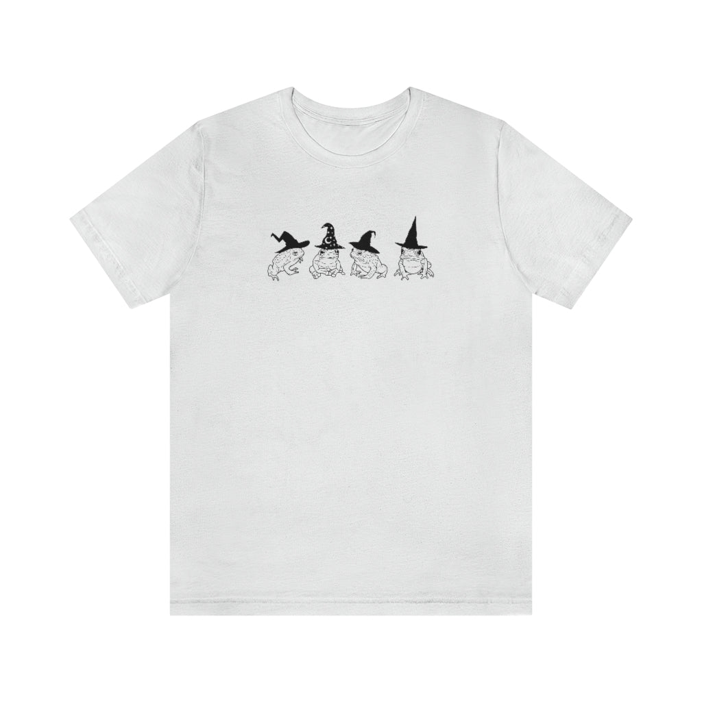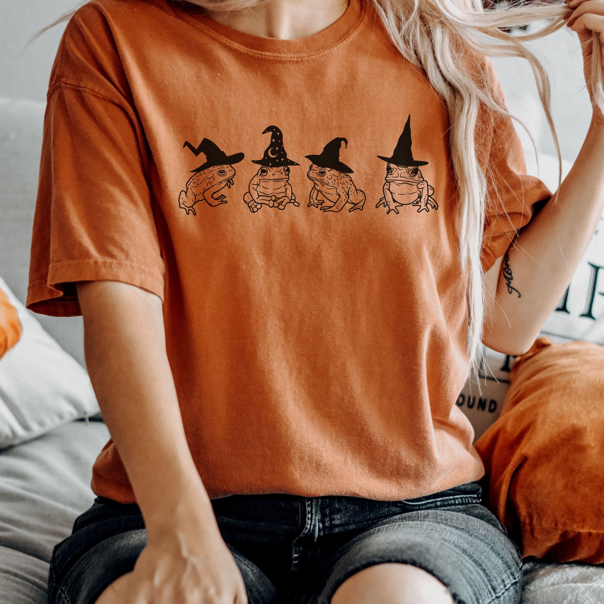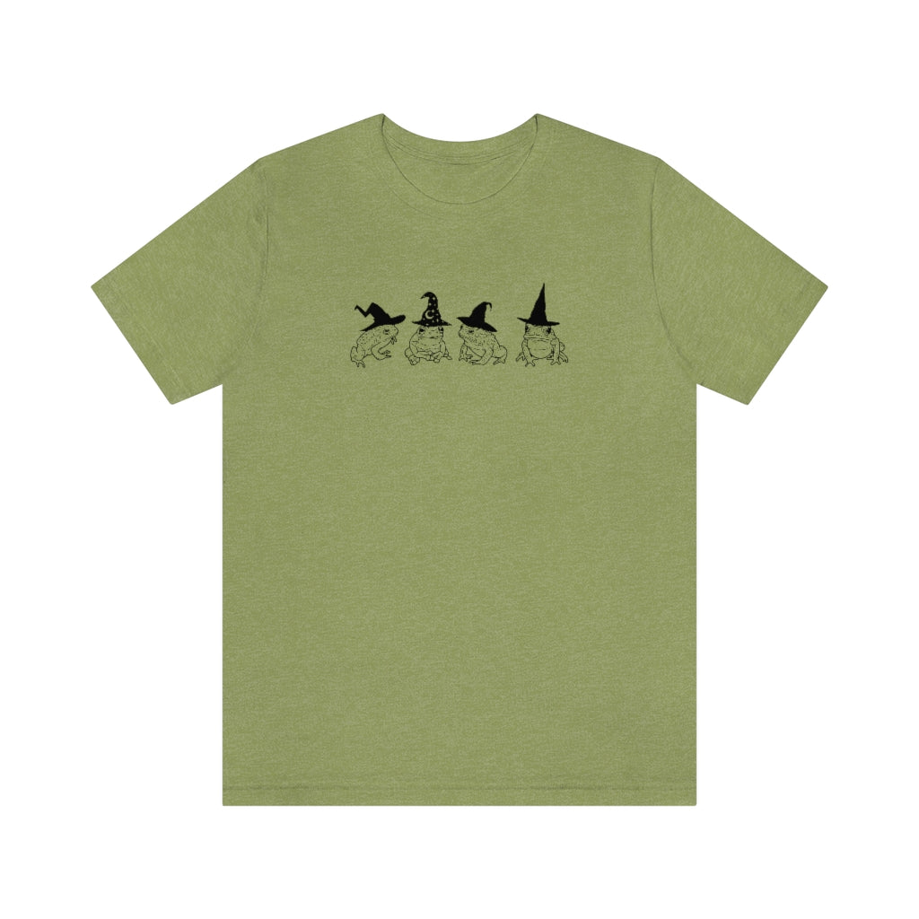 Stay Spooky all Halloween season long with this adorable t shirt featuring 4 witchy toad frogs wearing witches hats.